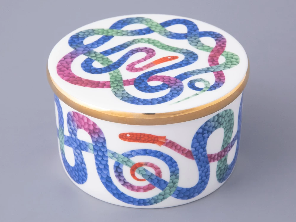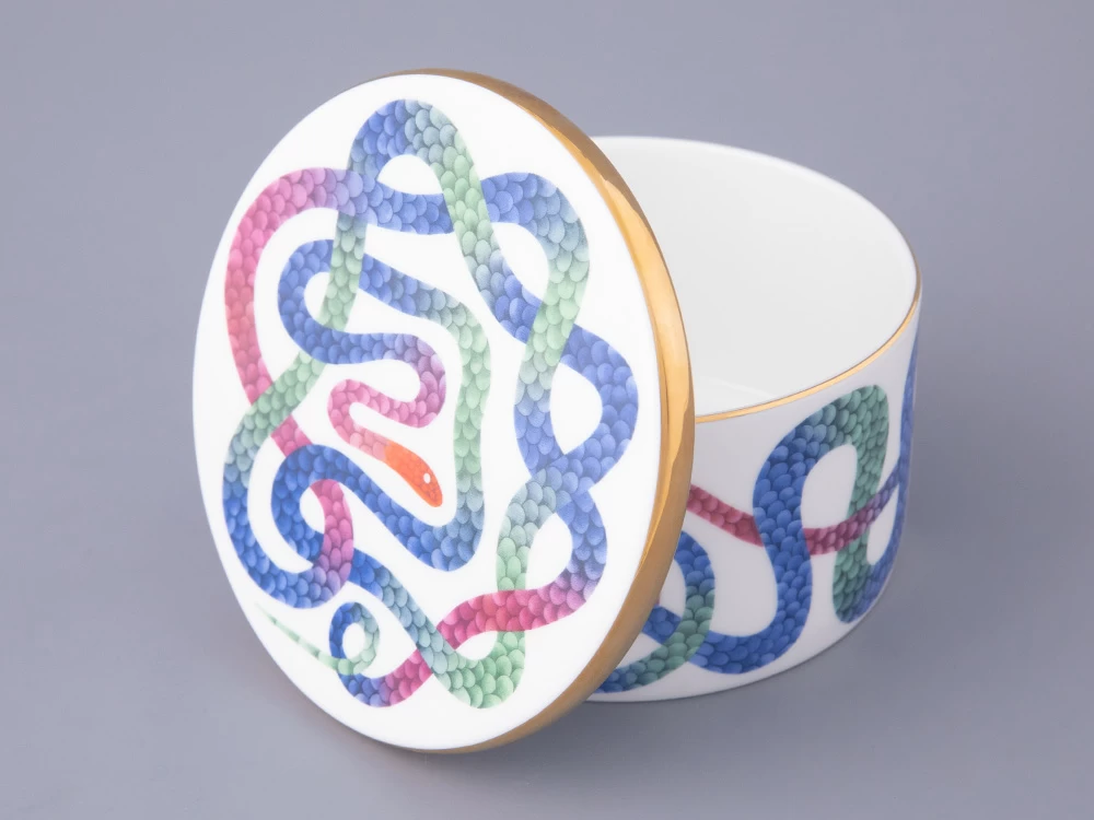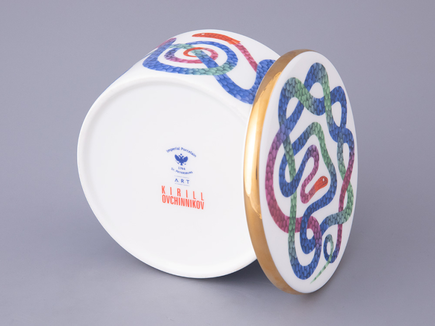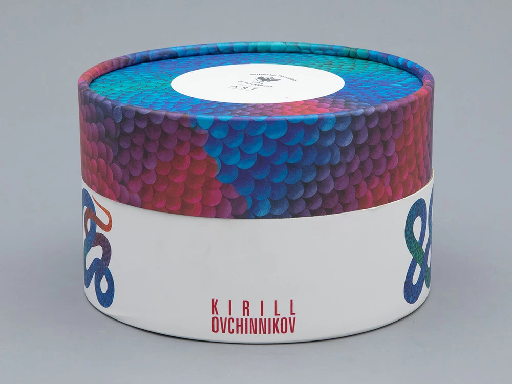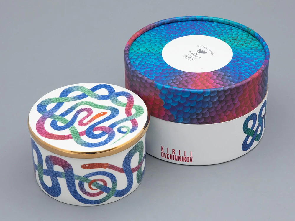 В дизайне шкатулки Кирилл Овчинников обращается к любимой им теме мифологических сюжетов. С одной стороны, змей на фарфоре – бесконечен и напоминает загадочного Уробороса. С другой – «Лунный змей» необыкновенно прекрасен. Он переливается в лунном свете и переносит в особенный, фантастический мир. В дизайне Кирилл Овчинников использует необычные цветовые сочетания, которые создают восхитительный контраст с костяным фарфором.