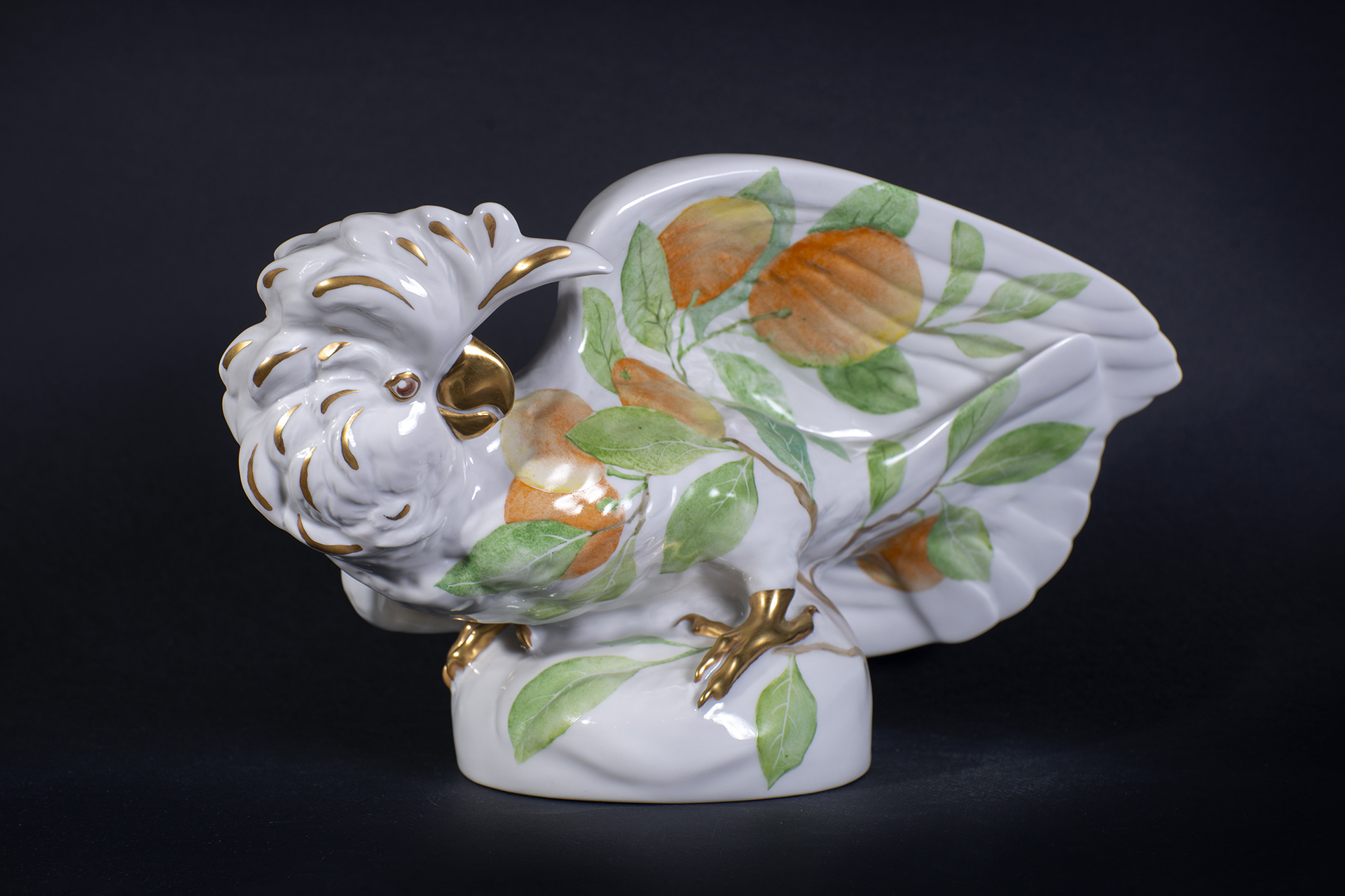 Коллекция анималистической скульптуры, которой славится Императорский фарфоровый завод, обновляется произведениями современных скульпторов. Пластичный, эмоционально выразительный образ птицы – какаду, созданный Галиной Белаш, органично дополняют цветовые акценты. Художник Ольга Будашова украсила скульптуру яркими плодами апельсина. Такое прием подчеркивает декоративность скульптуры и, при этом, сохраняет живой язык природы.