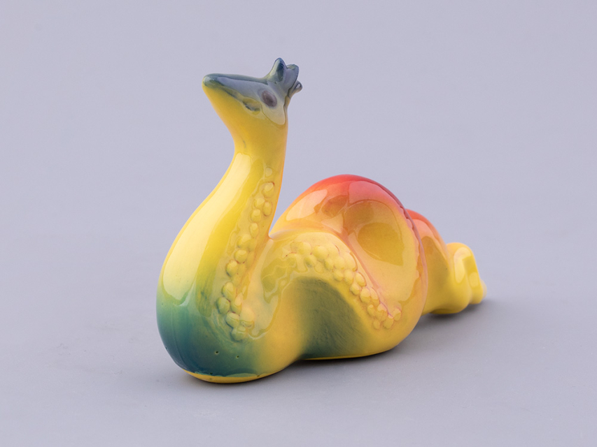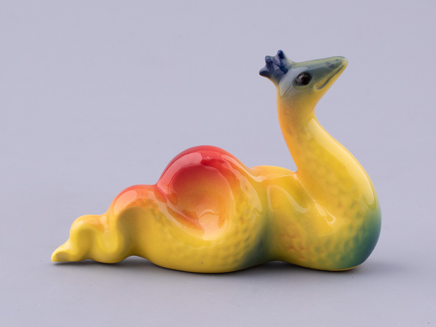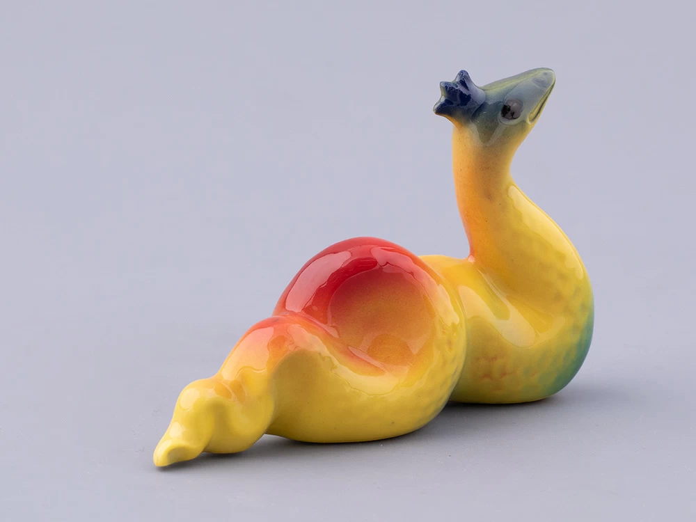 Скульптура отличается неординарной росписью. Обычно фарфоровая анималистика декорируется с учетом реального окраса того или иного животного. В данном случае художник Нина Троицкая подарила змейке яркую декоративную роспись подглазурными красками.