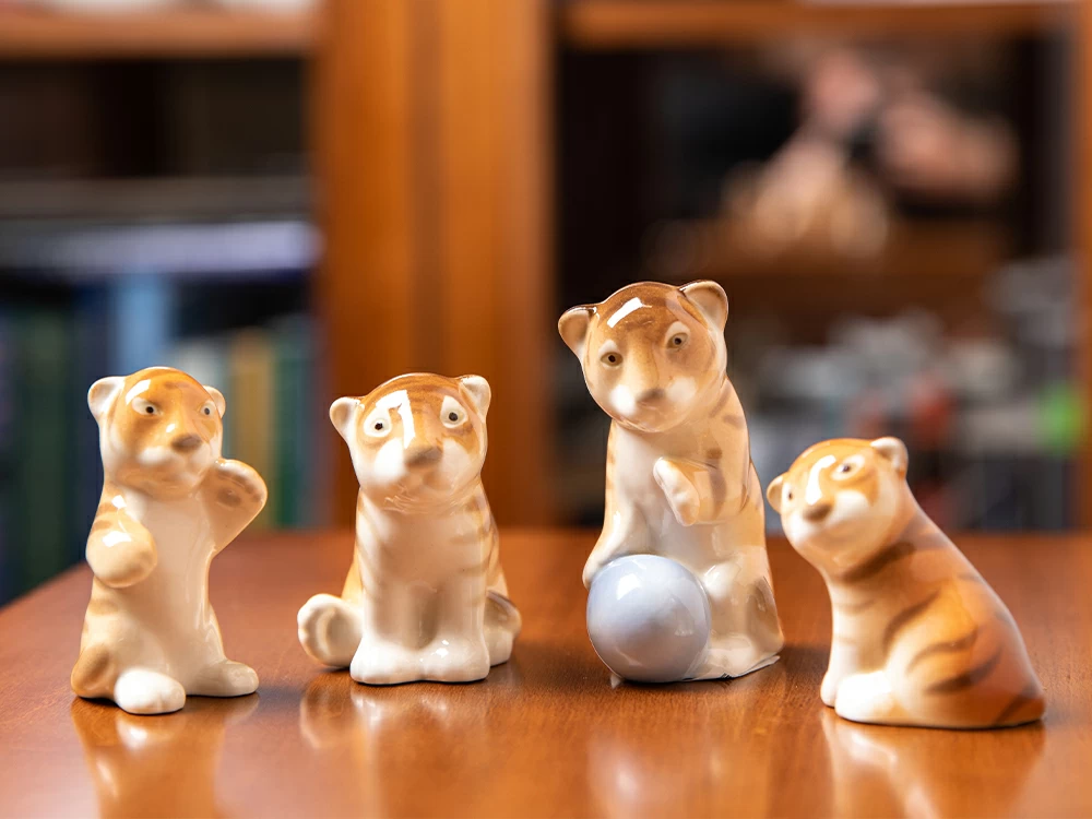 Роспись скульптур производится вручную опытными мастерами цеха подглазурной росписи. К году тигра по восточному календарю в ассортиментную коллекцию вошла оригинальная серия «Тигрята» Татьяны Чариной. Каждый из персонажей серии наделен своим характером: Задира, Юнга, Тихоня, Актер. Забавные добродушные тигрята в ярких костюмах создадут хорошее настроение и станут счастливым талисманом предстоящего года.