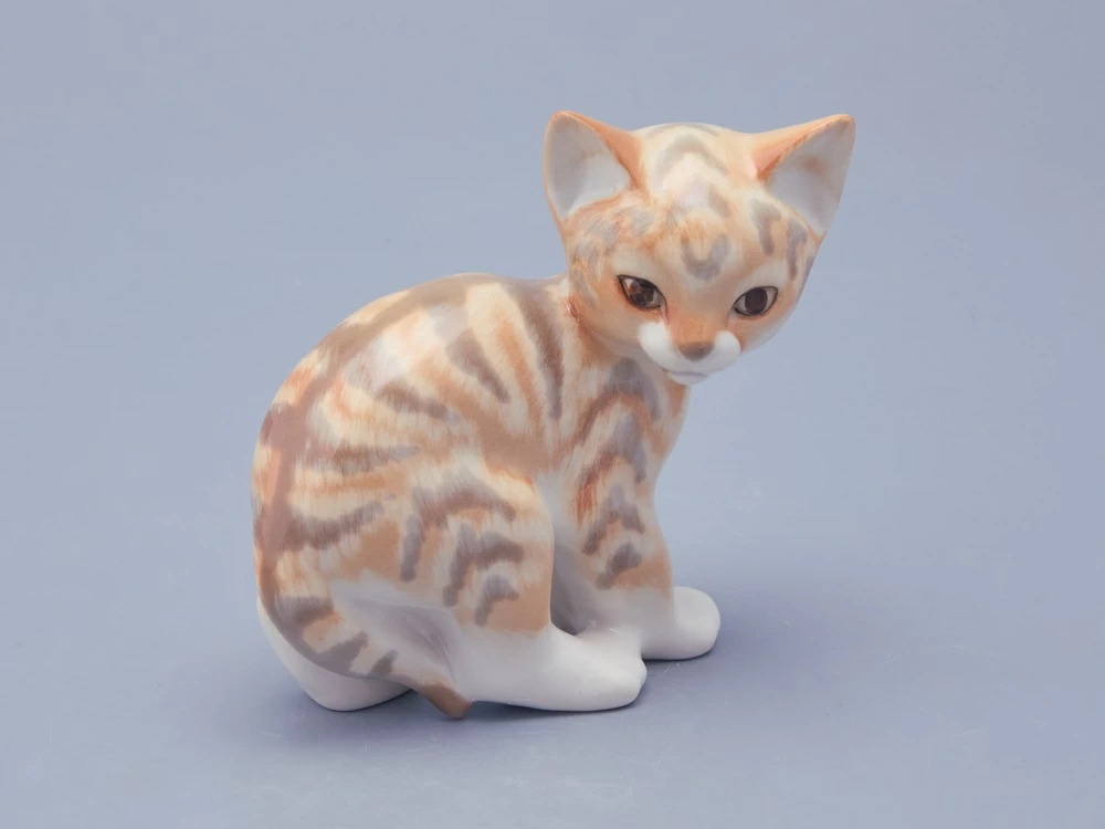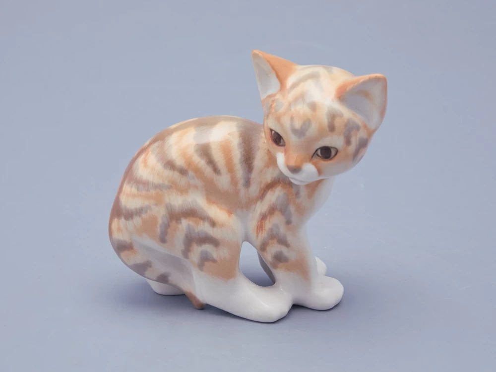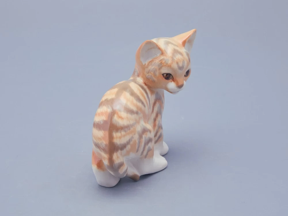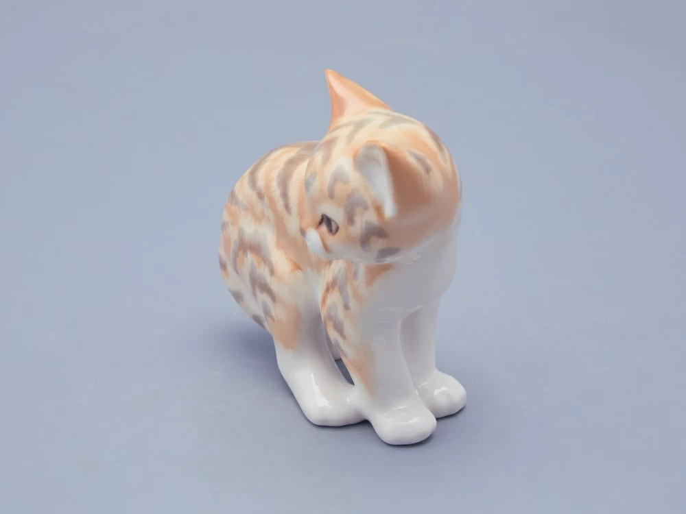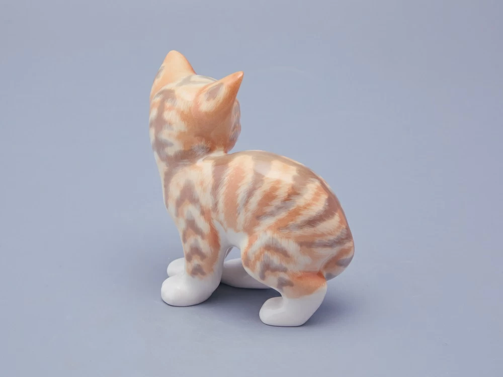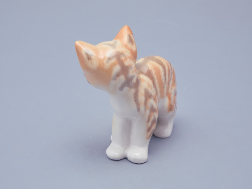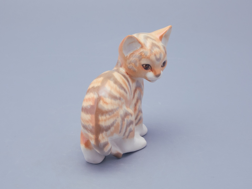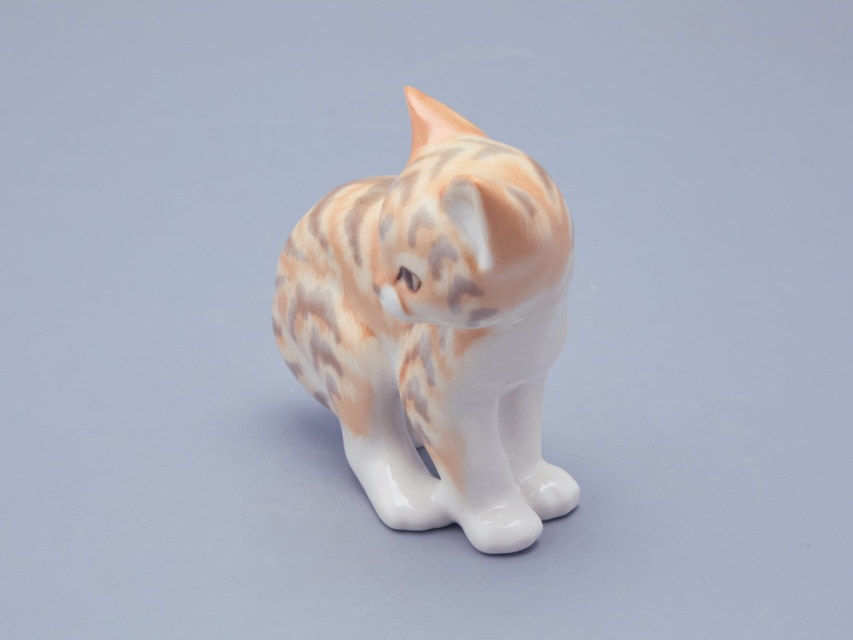 Скульптура Кошка изготовлена на Императорском фарфоровом заводе из мягкого фарфора в технике ручной подглазурной росписи. Автор формы - Веселов П.П. Высота скульптуры - 140 мм.