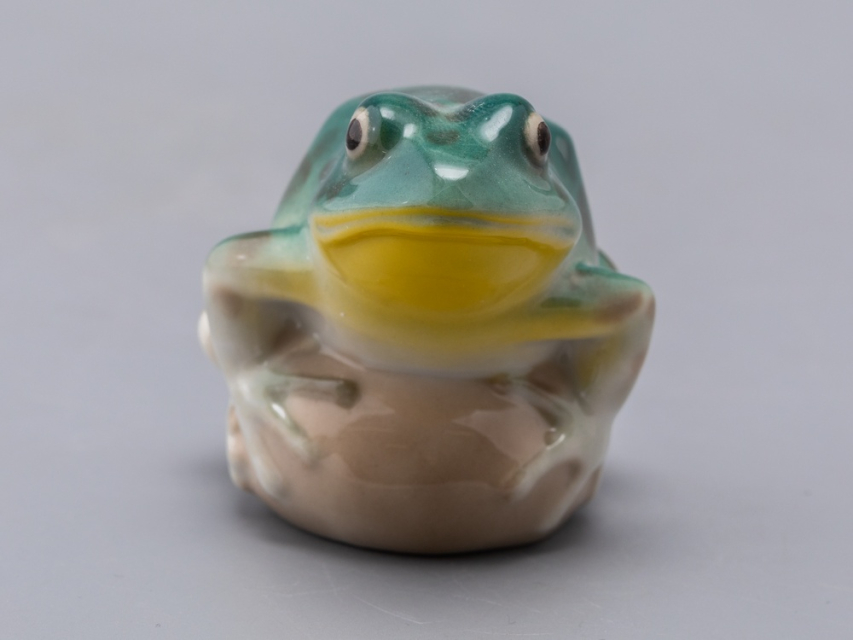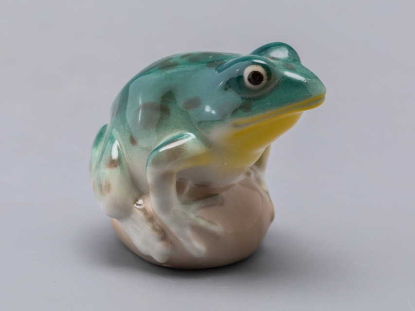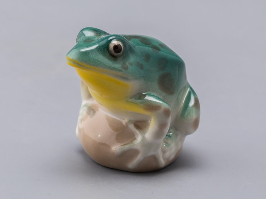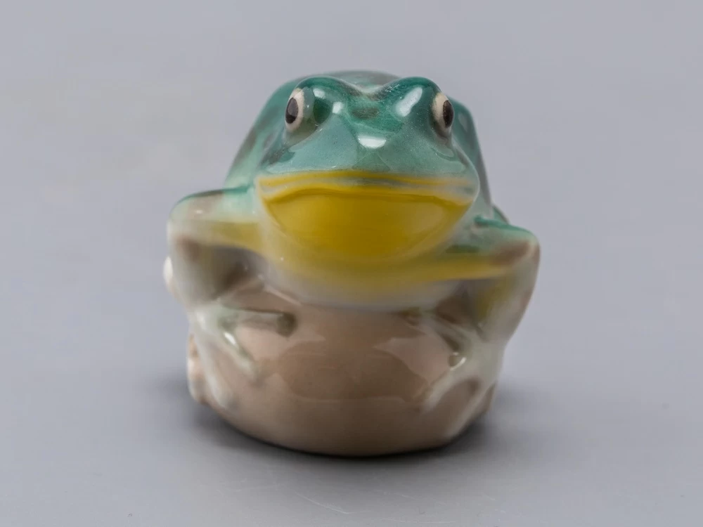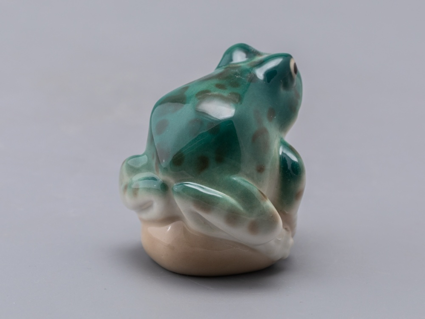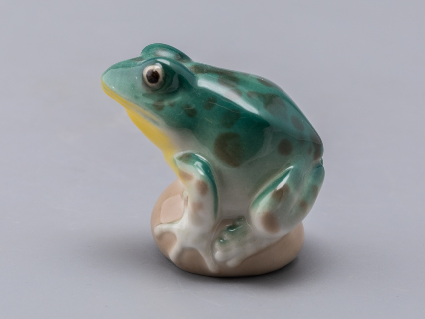 Скульптура Лягушка прудовая изготовлена на Императорском фарфоровом заводе из мягкого фарфора в технике ручной подглазурной росписи. Автор формы - Никольская М.Ю. Высота скульптуры - 65 мм.