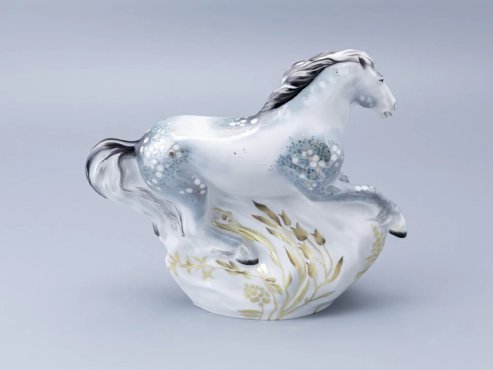 Скульптор Галина Белаш воплотила в фарфоре величественную лошадь на просторах лугов. Восхитительная фигура лошади, выполненная из фарфора, наполнена движением и энергией жизни. Ее бег символизирует стремление вперед, свободу мысли и внутреннюю гармонию. Точное соблюдение пропорций и пластики животного сочетается с ручной надглазурной росписью. Созданная Заслуженным художником РФ Ниной Троицкой, роспись создает тонкую игру света и тени, сияя натуральным золотом и блеском роскошных люстровых красок. Скульптура идеально подойдет для украшения жилого пространства или рабочего кабинета, прекрасно расположится на книжной полке, выделится на журнальном столике или на каминной полке.