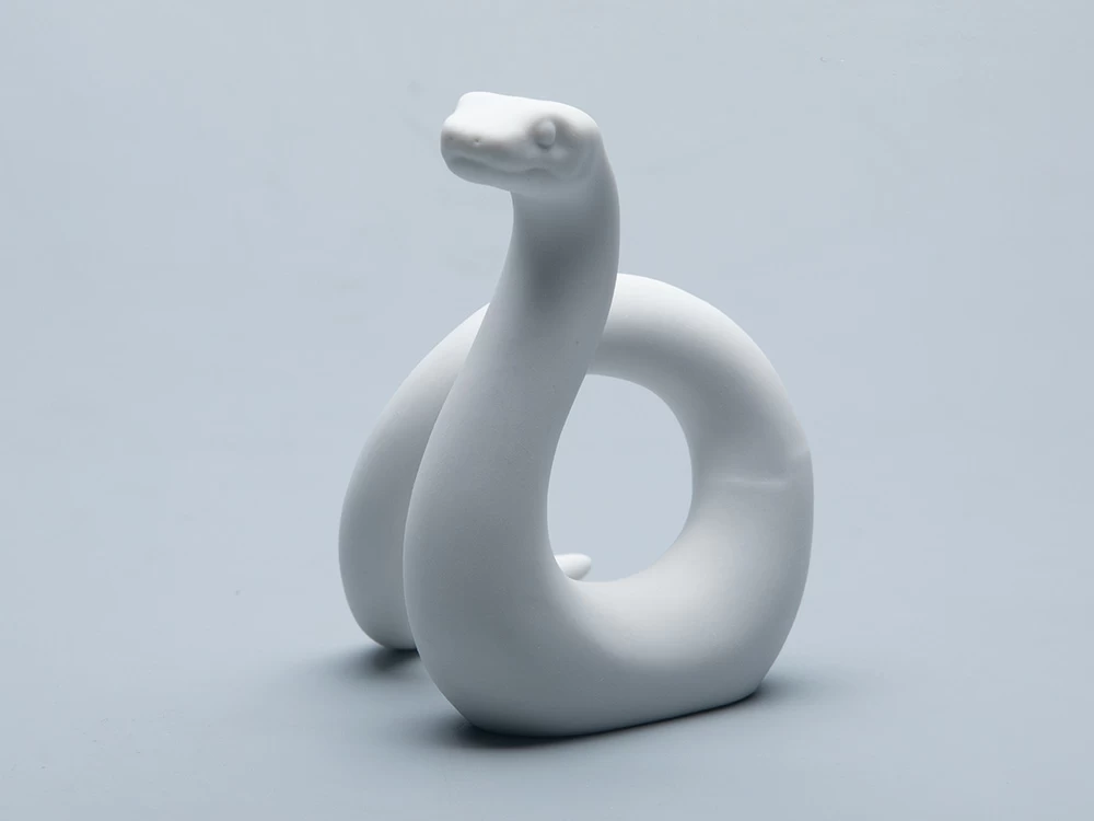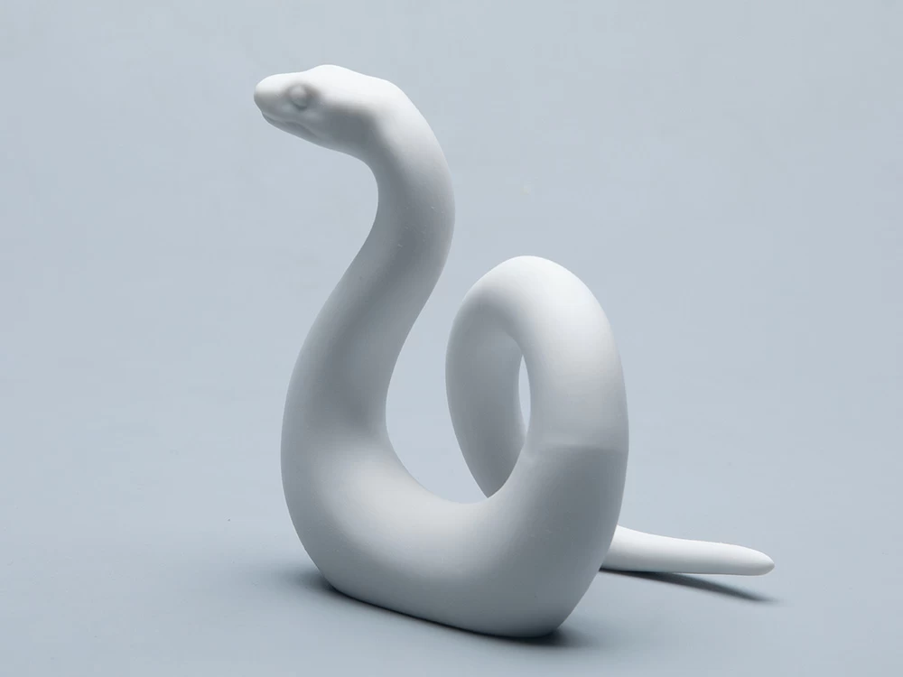 Фарфоровая фигурка представляет собой изящную змею, свернувшуюся в элегантную спираль. Тонкие линии тела змеи подчеркивают её гибкость и грациозность, а плавные переходы от головы к хвосту создают ощущение непрерывного движения. Фарфоровый материал придает изделию легкость и воздушность, делая его одновременно хрупким и прочным.