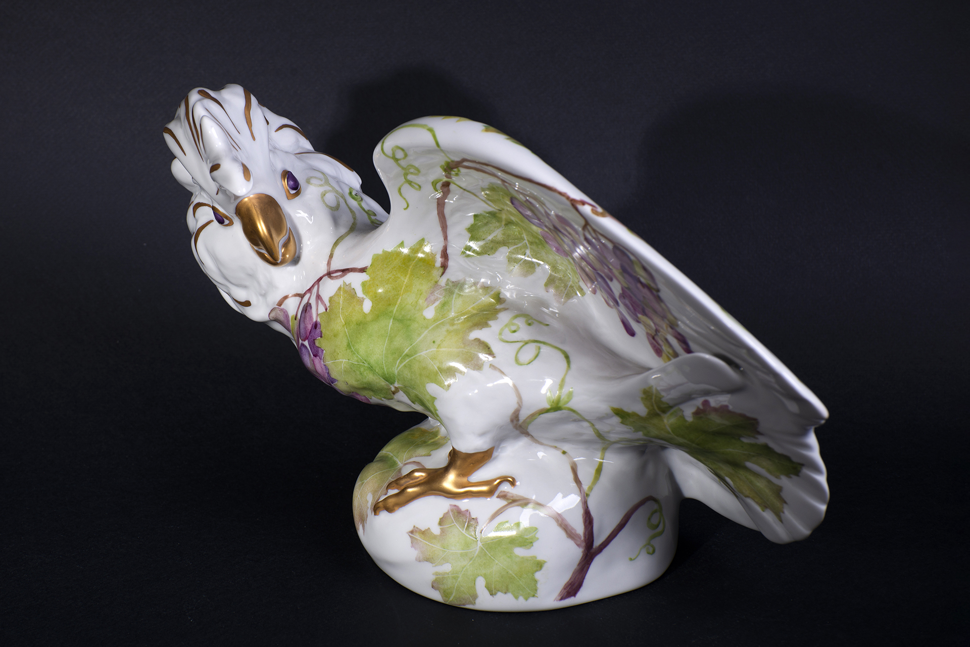 Коллекция анималистической скульптуры, которой славится Императорский фарфоровый завод, обновляется произведениями современных скульпторов. Пластичный, эмоционально выразительный образ птицы – какаду, созданный Галиной Белаш, органично дополняют цветовые акценты. Художник Ольга Будашова украсила скульптуру сочными гроздьями винограда. Такое прием подчеркивает декоративность скульптуры и, при этом, сохраняет живой язык природы.