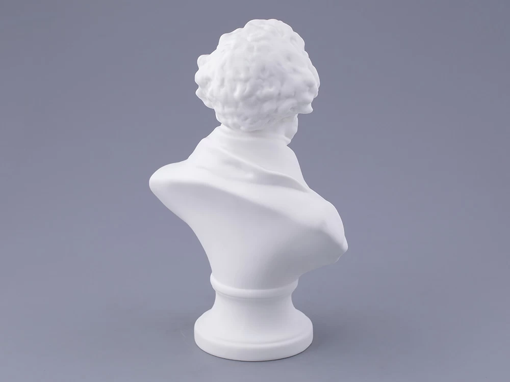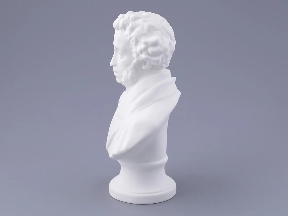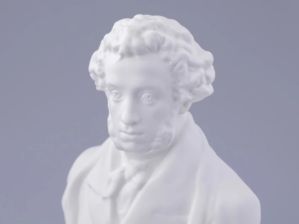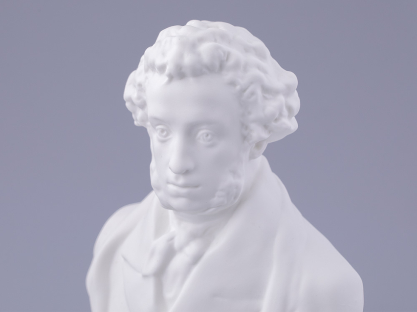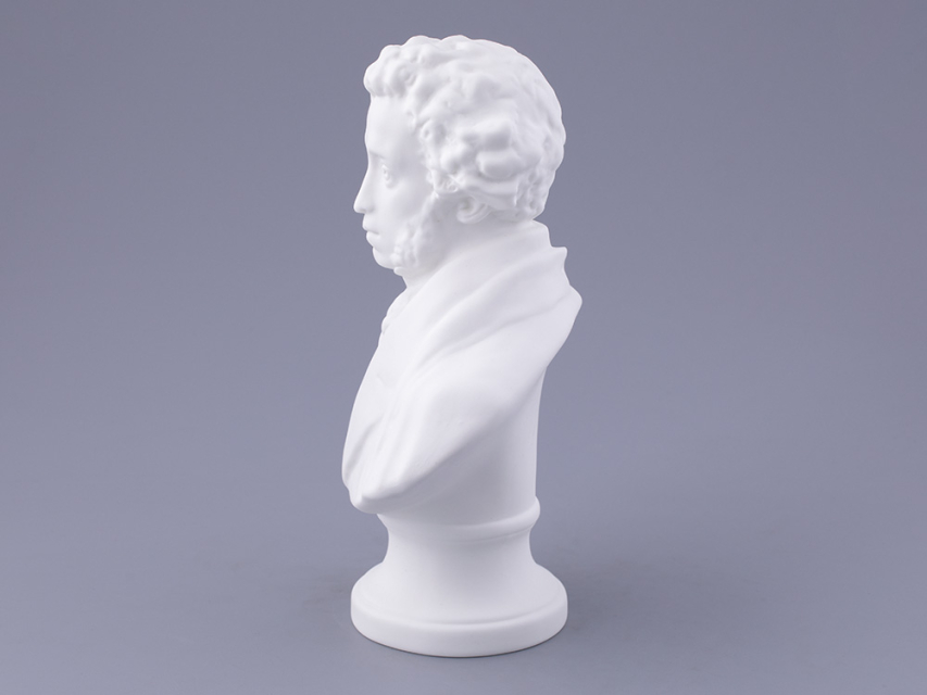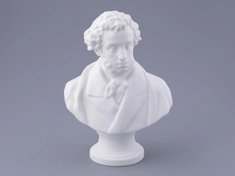 Уже более столетия искусство русского фарфора невозможно представить без обращения к пушкинской теме. Пушкиниана ИФЗ достаточно широка, и практически каждая юбилейная дата сопровождается выпуском новых произведений, впоследствии занимающих почетное место в музеях и частных коллекциях. Очередной всплеск пушкинской темы в изобразительном искусстве, в том числе и в фарфоре, возник в преддверии 150-летия со дня рождения поэта. Тогда, в 1949 году, Леонид Юльевич Эйдлин, известный петербургский скульптор, создает фарфоровый бюст А.С.Пушкина. Образ поэта, авторства талантливого мастера, строг и внутренне сдержан, но обладает особой смысловой содержательностью и передает едва уловимое настроение и характер выдающегося героя произведения. Скульптурный портрет, выполненный согласно классическим канонам, наделен пластической выразительностью и внутренней гармонией.