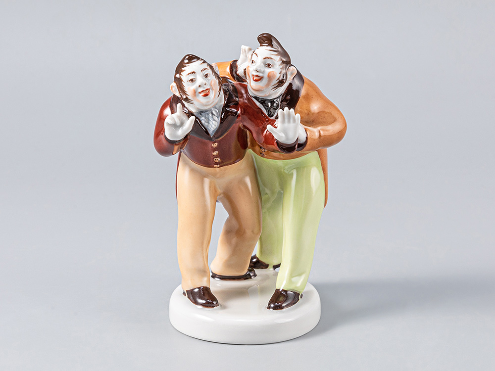 Скульптура ф. Бобчинский и Добчинский изготовлена на Императорском фарфоровом заводе из твердого фарфора с применением только ручной росписи. Автор формы - Воробьев Б.Я. Высота изделия - 124 мм.