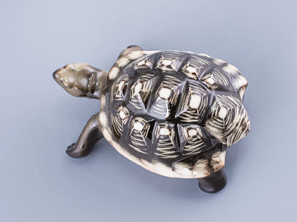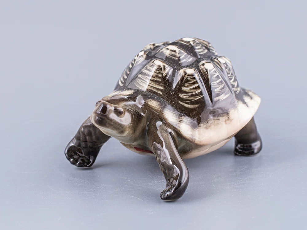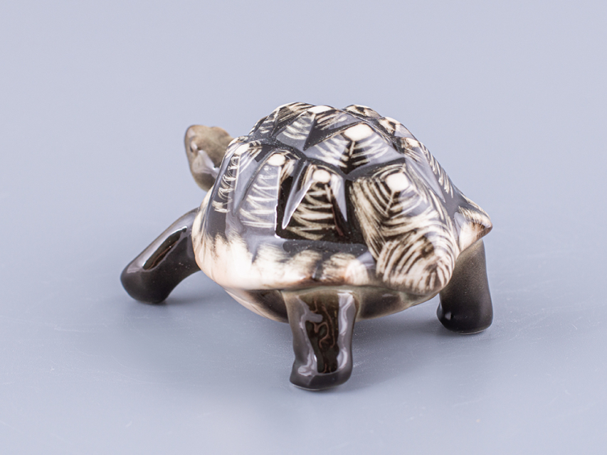 Скульптура Черепаха изготовлена на Императорском фарфоровом заводе из мягкого фарфора в технике ручной подглазурной росписи. Автор формы - Никольская М.Ю. Высота скульптуры - 64 мм.