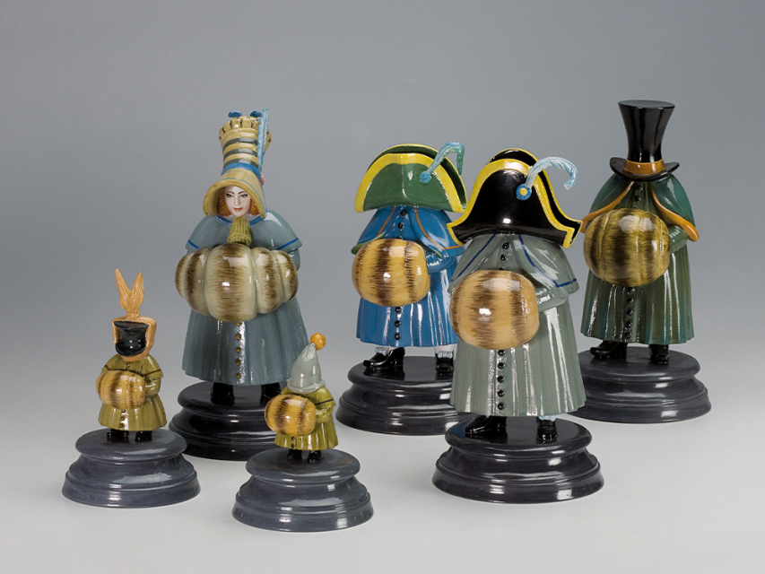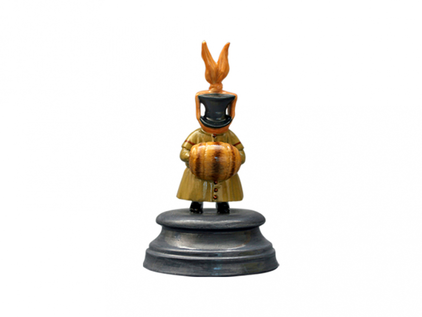 Роспись выполнена в технике надглазурной живописи надглазурными красками. Коллекция включает в себя 12 скульптур, из которых с первой по шестую – взрослые гости и с седьмой по двенадцатую – дети. Скульптура изображает маленького гостя, в плаще песочного цвета и в черном цилиндре, поверх цилиндра оранжевый платок, хвостики платка торчат вверх. Руки гостя спрятаны в оранжевую с темными полосами муфту. Скульптура на постаменте в форме усеченного конуса с горизонтальным круговым рельефом. На дне постамента стоит название, надпись «Персонаж балета “Щелкунчик”», подпись Шемякина и клеймо «Орел»
