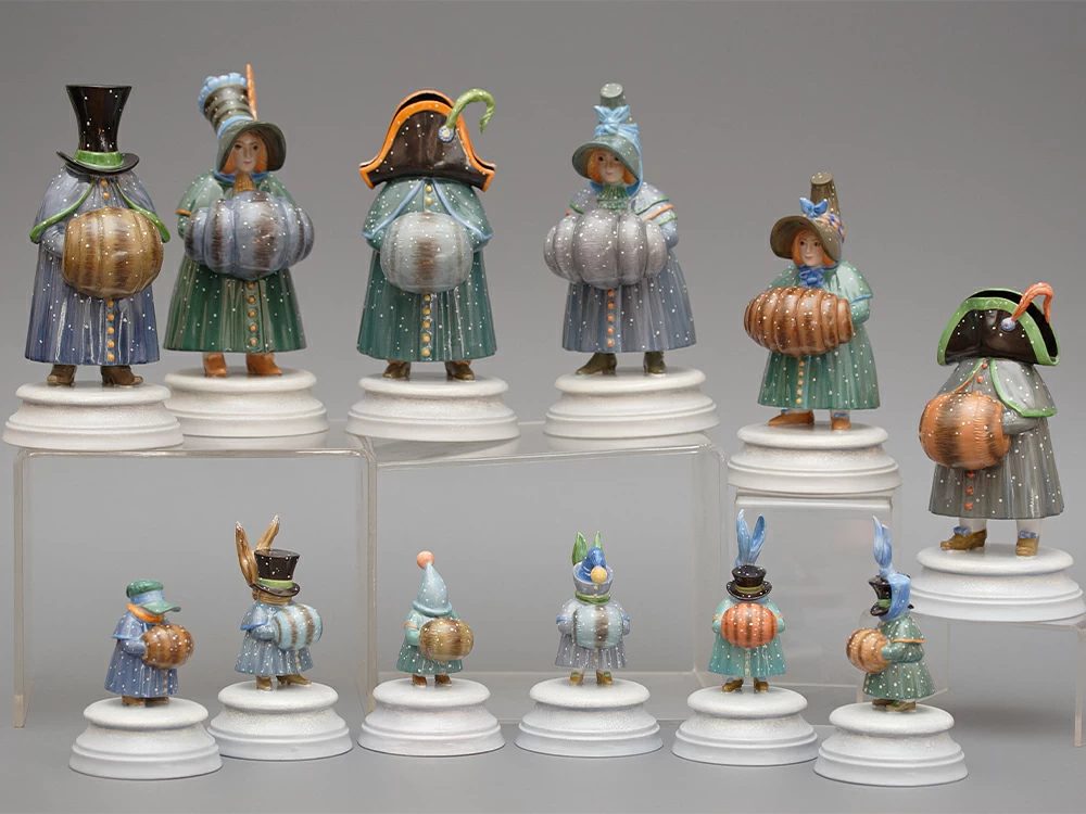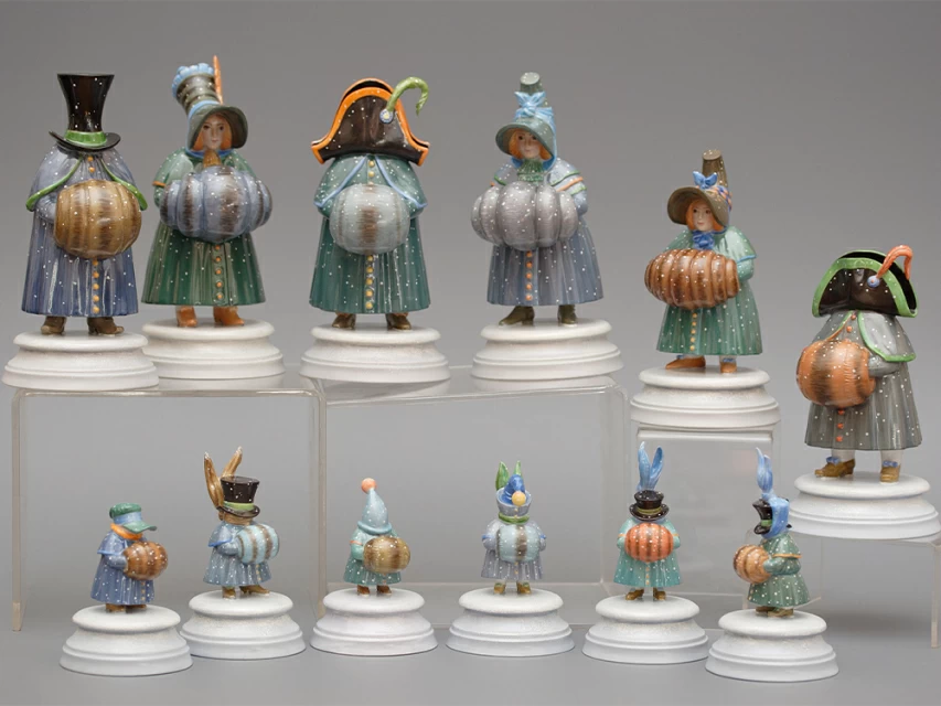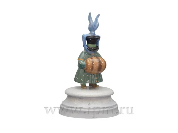 Роспись выполнена в технике надглазурной живописи надглазурными красками. Коллекция включает в себя 12 скульптур, из которых с первой по шестую – взрослые гости и с седьмой по двенадцатую – дети. Скульптура изображает маленького гостя, в плаще зеленого цвета и в черном цилиндре, поверх цилиндра голубой платок, хвостики платка торчат вверх. Руки гостя спрятаны в коричневую с темными полосами муфту. Скульптура на постаменте в форме усеченного конуса с горизонтальным круговым рельефом. На дне постамента название, надпись «Персонаж балета “Щелкунчик”», подпись Шемякина и клеймо «Орел»