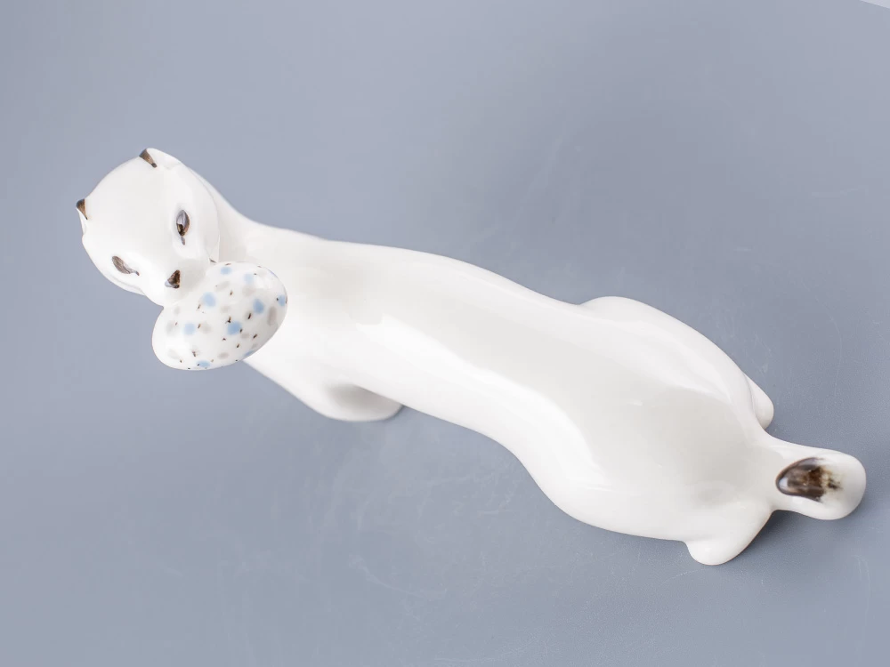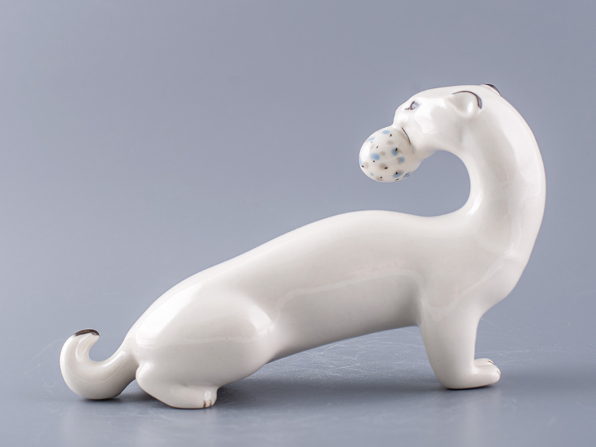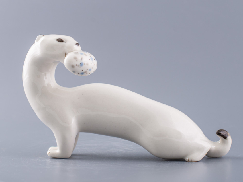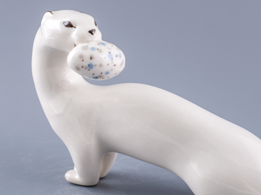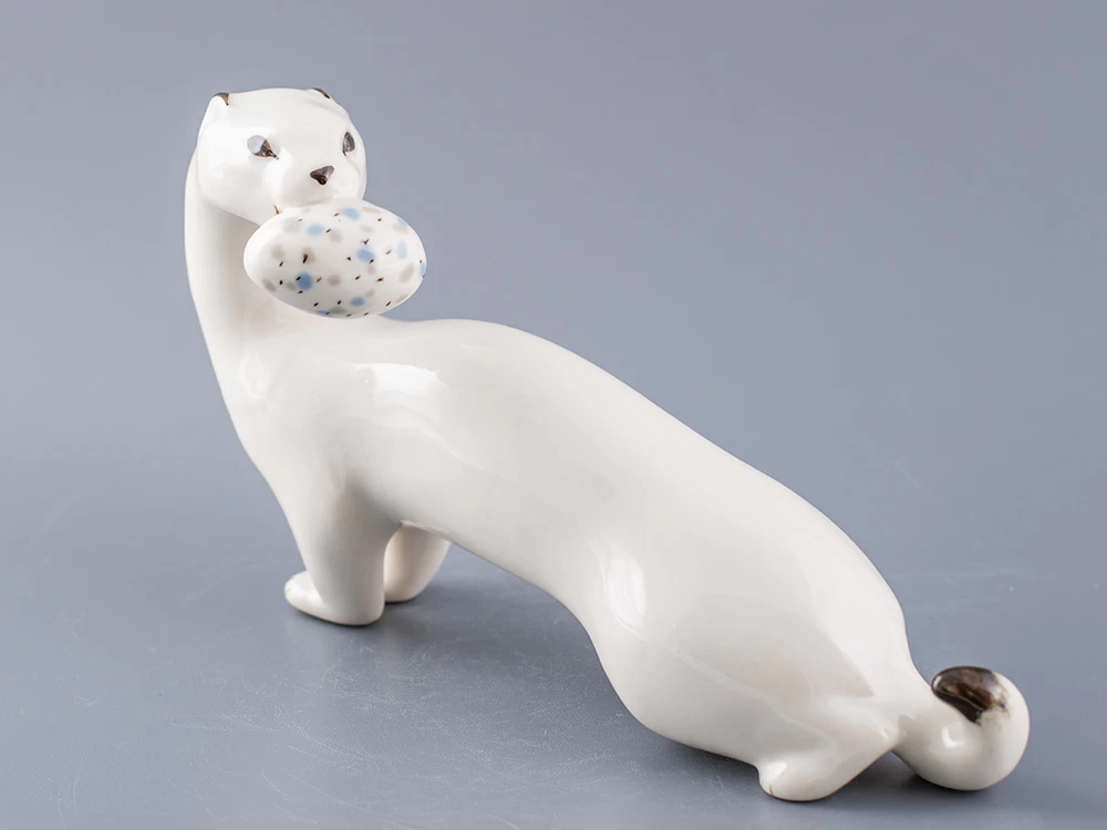 Скульптура Горностай изготовлена на Императорском фарфоровом заводе из мягкого фарфора в технике ручной подглазурной росписи. Автор формы - Веселов П.П. Высота скульптуры - 110 мм.