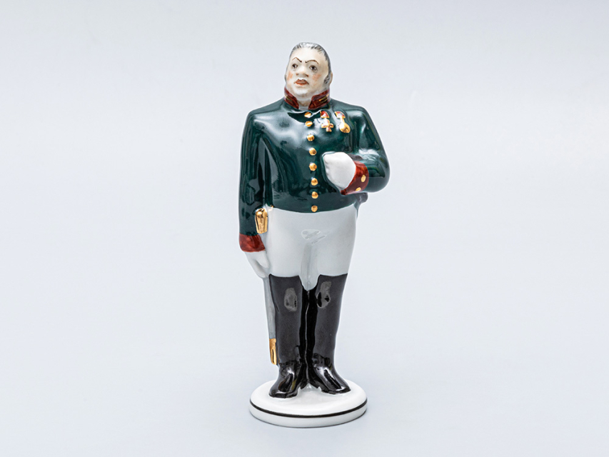 Скульптура ф. Городничий изготовлена на Императорском фарфоровом заводе из твердого фарфора с применением только ручной росписи. Автор формы - Воробьев Б.Я. Высота изделия - 155 мм.