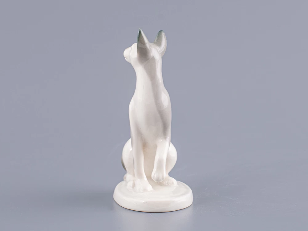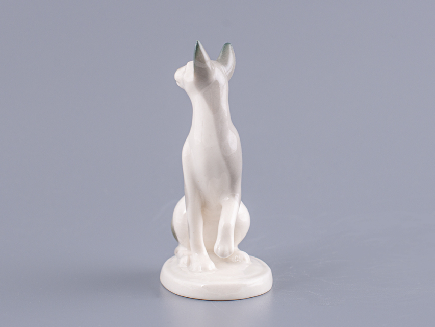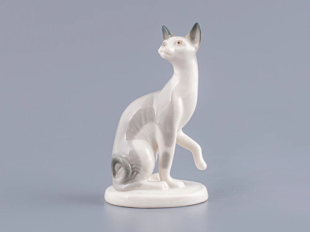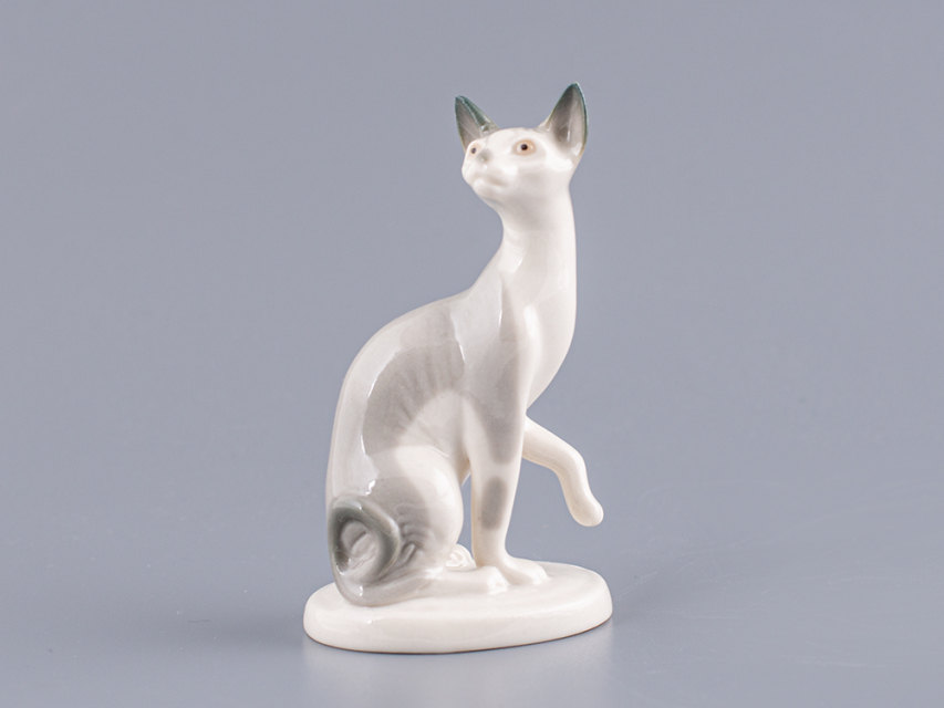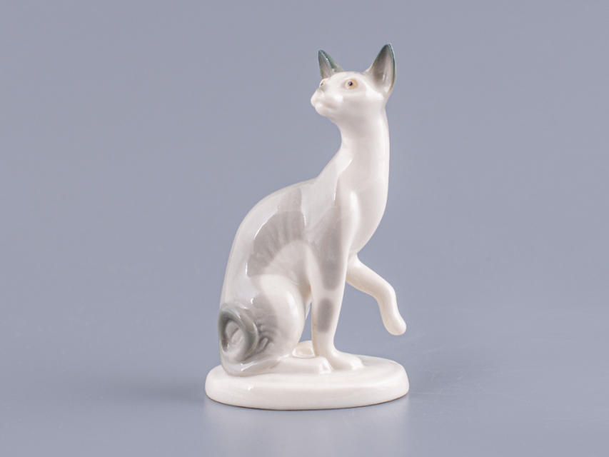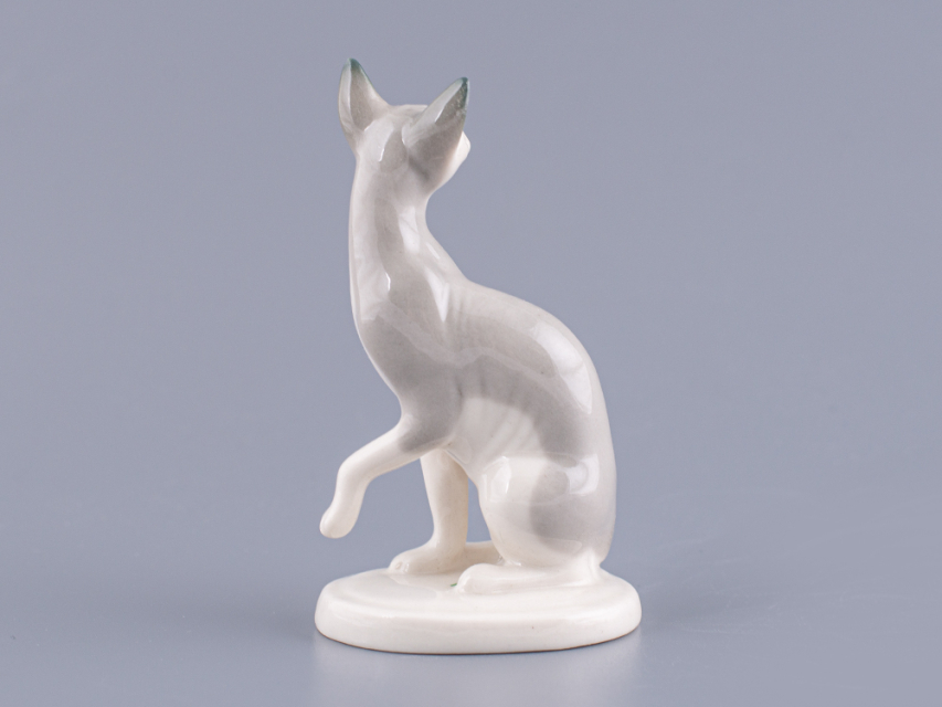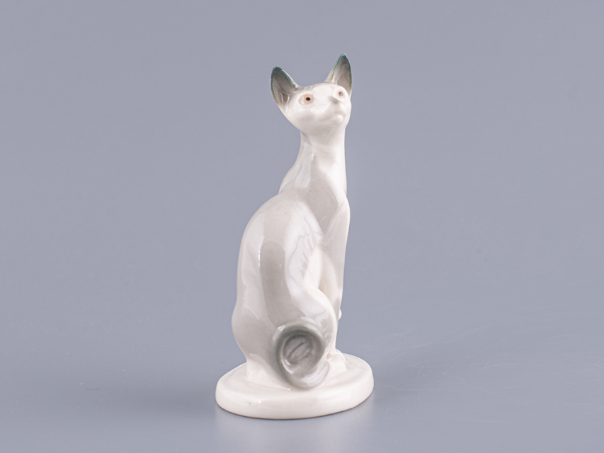 Скульптура Кошка-сфинкс изготовлена на Императорском фарфоровом заводе из мягкого фарфора в технике ручной подглазурной росписи. Автор формы - Никольская М.Ю. Высота скульптуры - 92 мм.