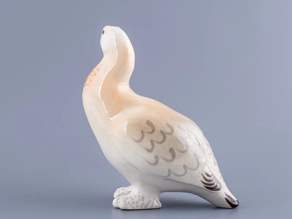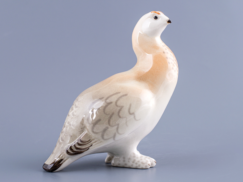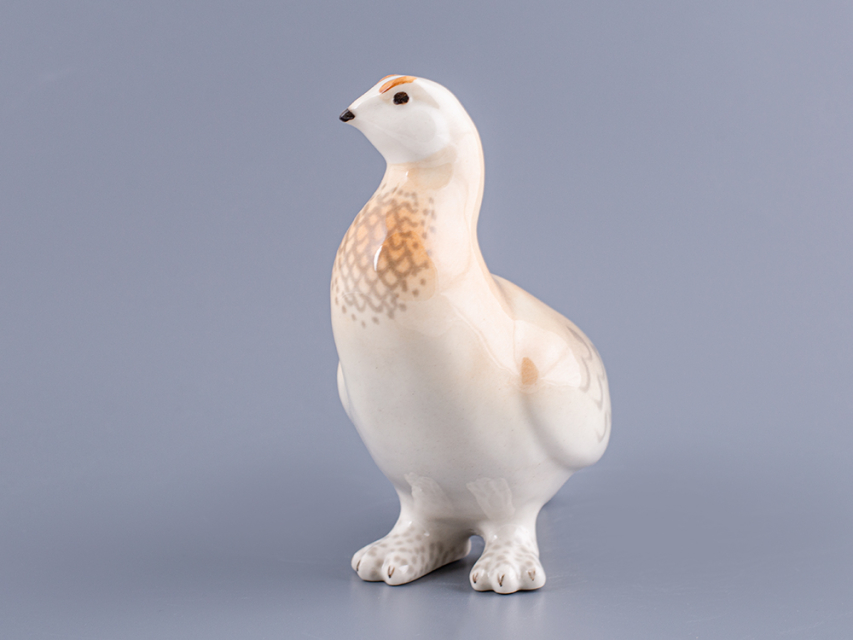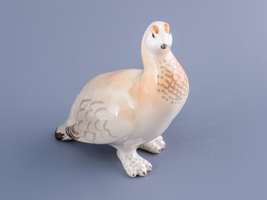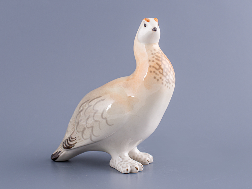 Скульптура Куропатка изготовлена на Императорском фарфоровом заводе из мягкого фарфора в технике ручной подглазурной росписи. Автор формы - Веселов П.П. Высота скульптуры - 136 мм.
