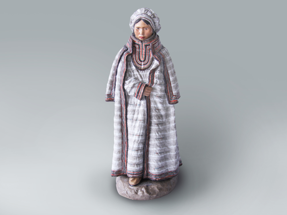 Алеуты – таинственный северный народ, расселившийся на территории Алеутских островов, Аляски и Камчатского края. Их национальные костюмы отличаются особой экзотичностью. Размещаясь в регионе с очень суровым и влажным климатом, алеуты были вынуждены искать способы защититься от непогоды. Их верхняя одежда сделана из птичьих шкур и одевается перьями наружу. Дождь и морские брызги стекают по перьям, оставляя алеутов сухими. На время выхода в море верхняя одежда для дополнительной защиты покрывается ещё одной накидкой, изготовленной из кишок морских животных. Костюмы алеутских женщин почти не отличаются от мужских, разве что декором другого формата и отсутствием конусообразных головных уборов. К тому же наряд женщины чаще выполнен из меха, чем из птичьих шкурок и кишок морских животных, ведь хранительницы домашнего очага лишены обязанности выходить в море за добычей. Все элементы костюма были созданы Павлом Каменским с удивительной точностью. Такая оригинальная и мастерски выполненная скульптура достойна украсить коллекцию настоящих ценителей искусства фарфора.