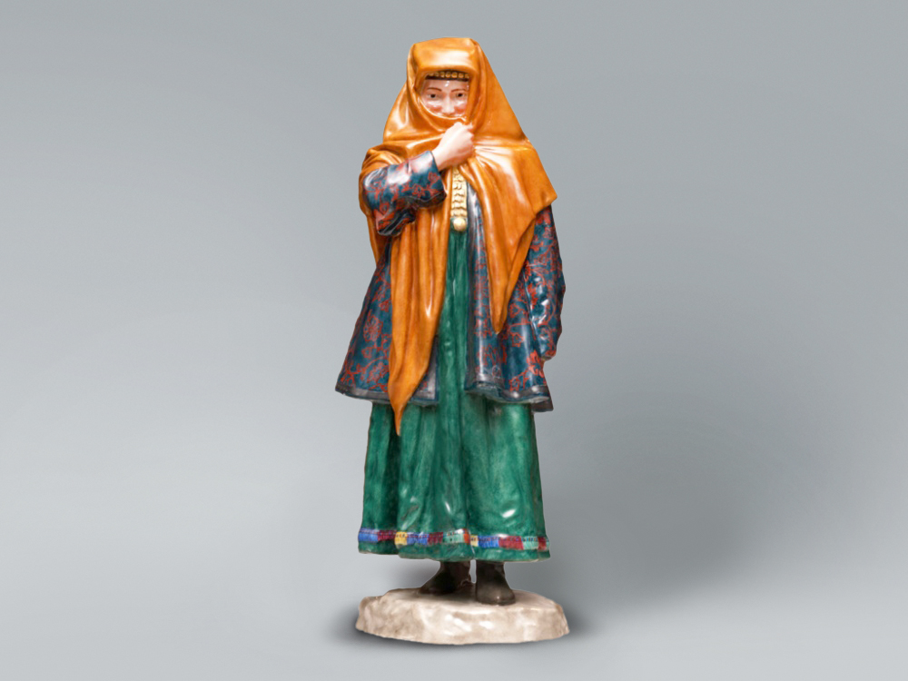 Яркий наряд «Башкирки» из серии «Народности России» отличается контрастностью цветового решения. Она одета в шелковое платье изумрудного цвета, поверх него синий камзол с выразительным цветочным орнаментом. Образ дополняет платок сочного оранжевого цвета, на шее виднеется нагрудное украшение, а шапочка под платком украшена монетками, спадающими на лоб. Скульптором Павлом Каменским выбрана очень интересная поза для изображения: пойман эмоционально заряженный и живой момент. Вместе со своим спутником «Башкиром», скульптурная пара представляет живой и динамичный образ, далекий от безжизненных этнографических манекенов. Фигуры «Башкир» и «Башкирка» обладают характером и передают национальный колорит.