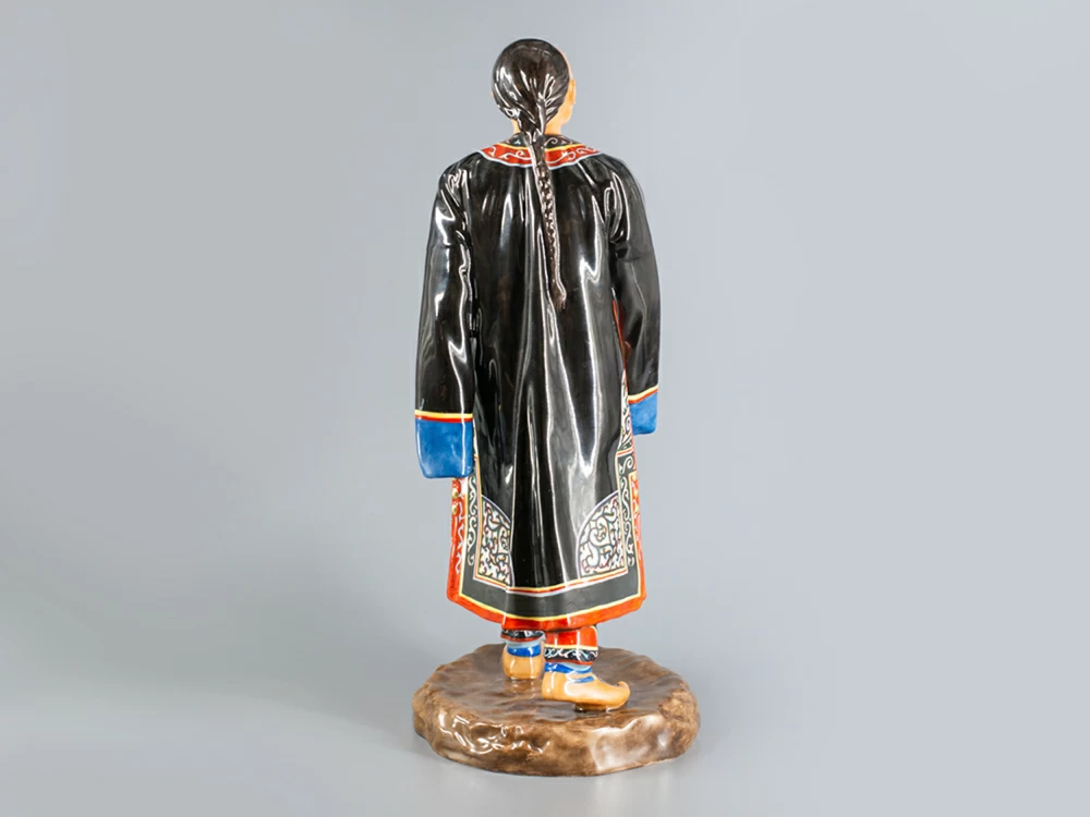 Гольды – устаревшее наименование малочисленного народа Дальнего Востока – нанайцев. Из-за своего непосредственного соседства с Россией и Китаем и набирающего обороты взаимовлияния народов друг на друга, гольды впитывали в себя во времена создания серии «Народности России» две культуры, хотя их собственная не менее интересна, разнообразна и экзотична, что и стремились запечатлеть создатели серии. Например, мужчины, вторя китайским традициям, заплетали длинные волосы в косу. Богато украшенный орнаментами халат изготавливался из нестандартного материала – рыбьей кожи, тем самым подчеркивалась исключительная роль рыболовства в жизни гольдов. Мастерски переданный ансамбль уникального народного костюма нанайцев делает скульптуру «Гольда» примечательной в серии «Народностей России».