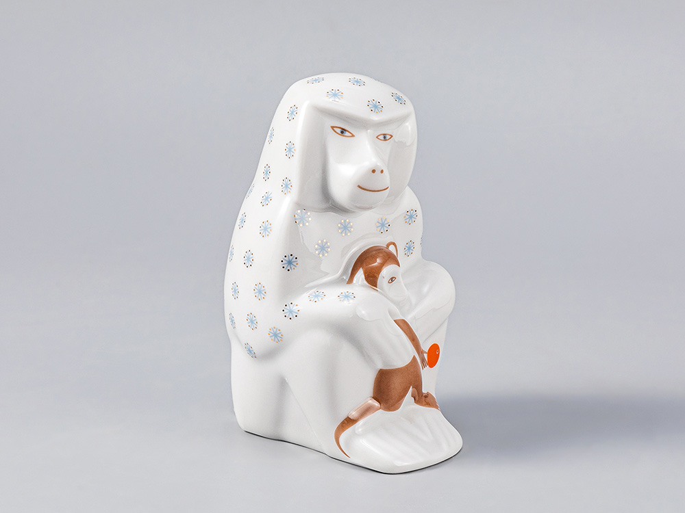 Роспись выполнена в технике надглазурной живописи надглазурными красками. Скульптурное изображение сидящего павиана обнимающего детеныша.