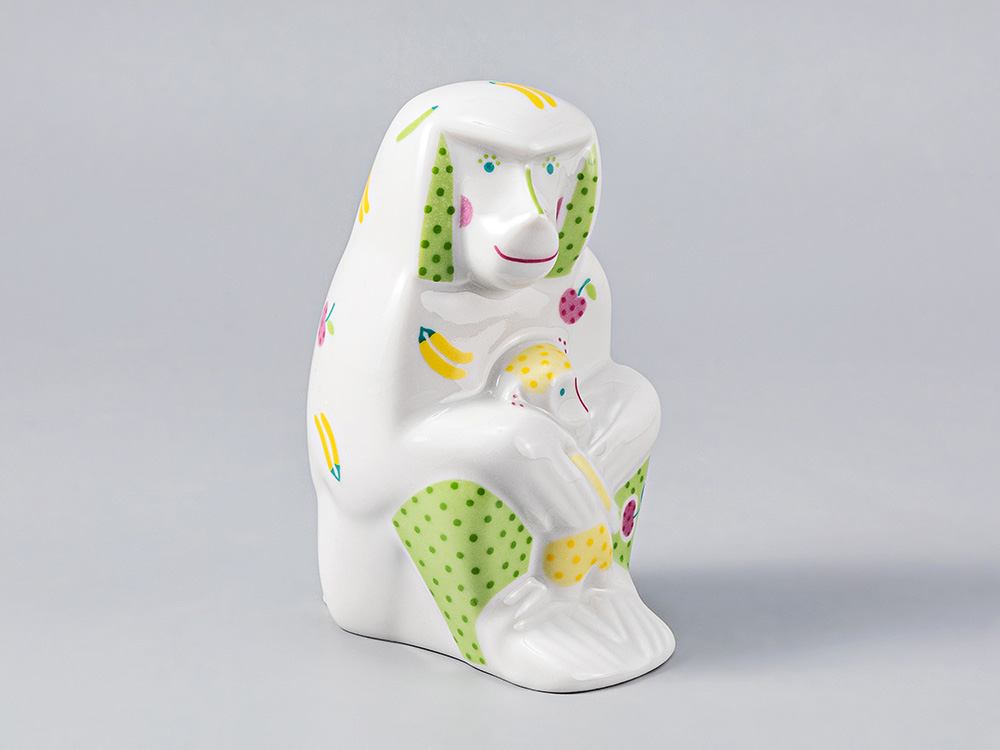 Роспись выполнена в технике надглазурной живописи надглазурными красками. Стилизованное изображение сидящего павиана обнимающего детеныша. На теле которого изображены бананы и яблоки.