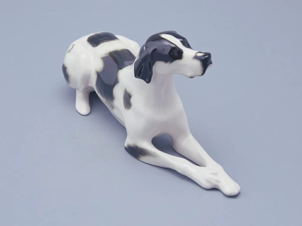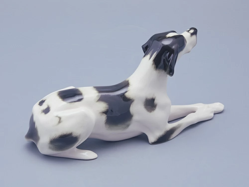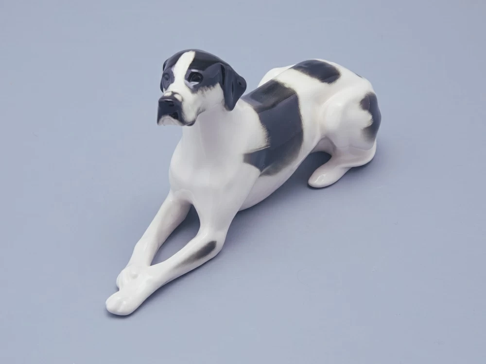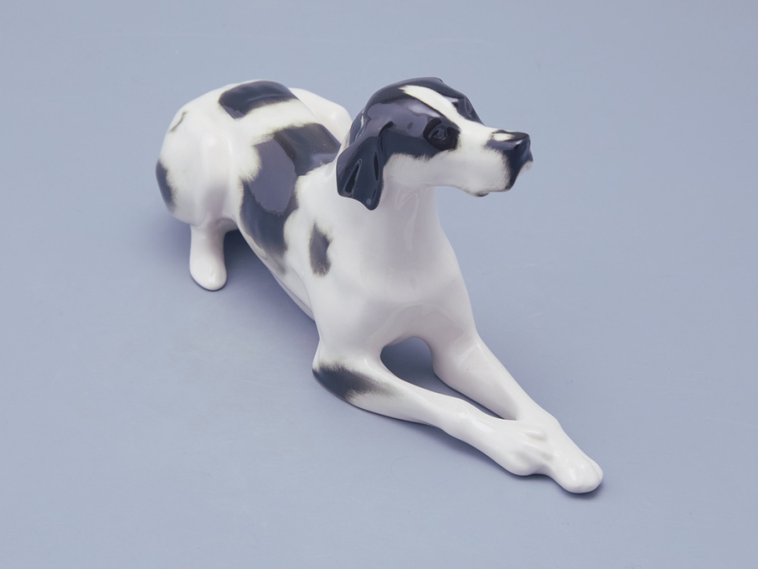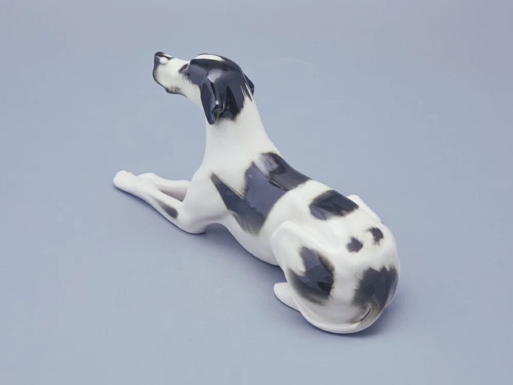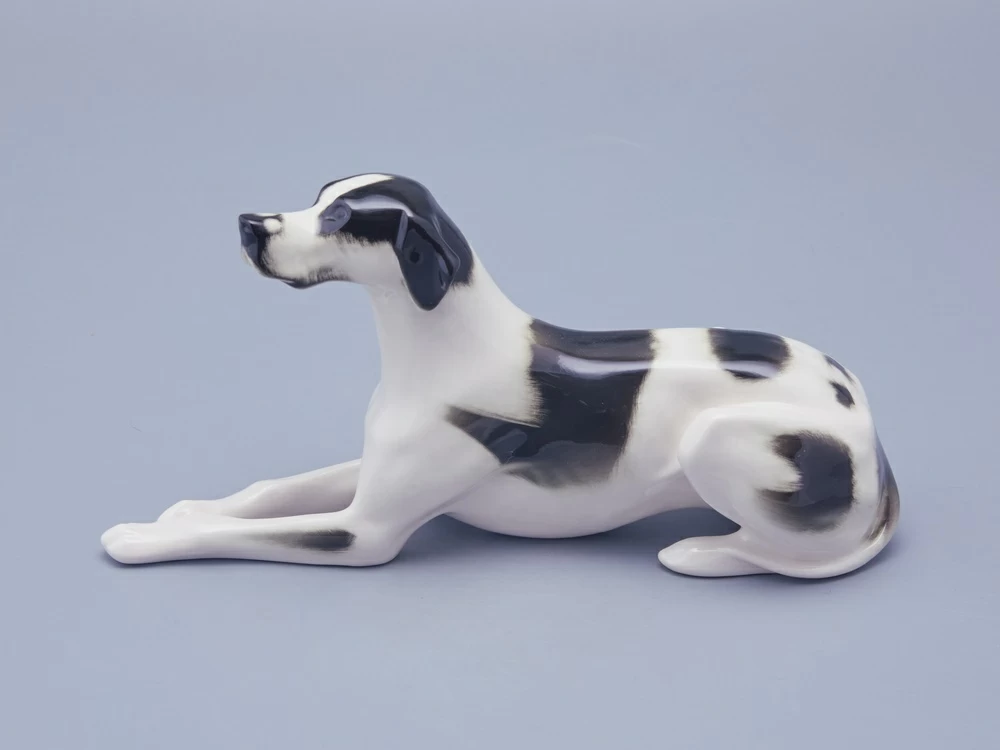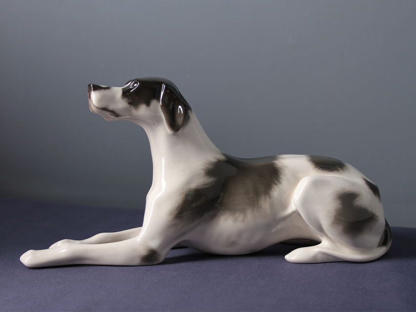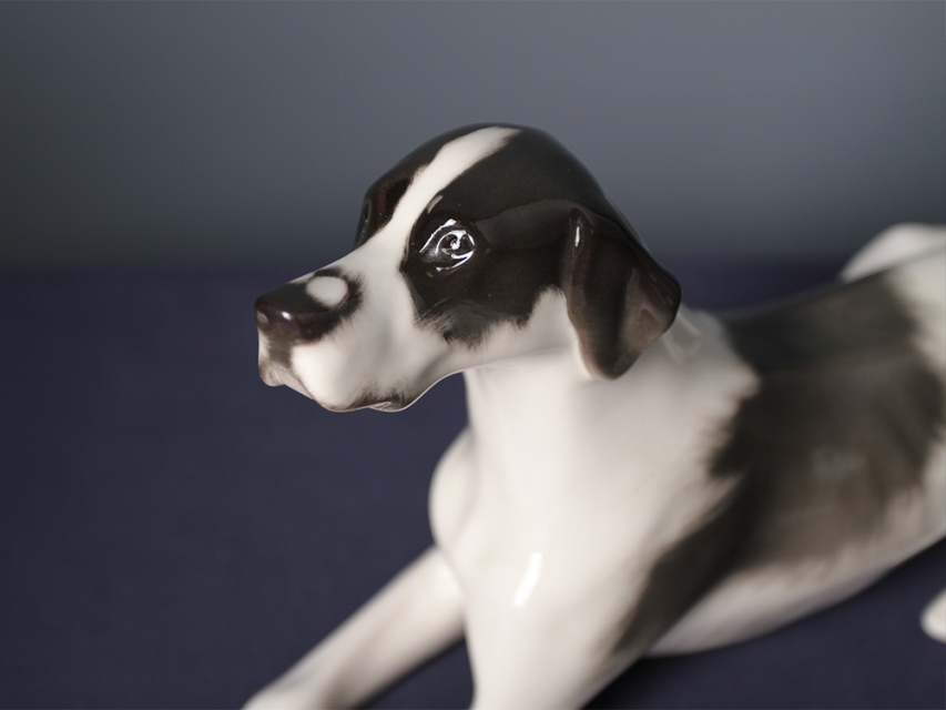 Скульптура Пойнтер изготовлена на Императорском фарфоровом заводе из мягкого фарфора в технике ручной подглазурной росписи. Автор формы - Ризнич И.И. Высота скульптуры - 145 мм. Скульптура "Пойнтер" создана в 1965 году народным художником РСФСР Ризничем Иваном Ивановичем (1908 - 1998 гг.)