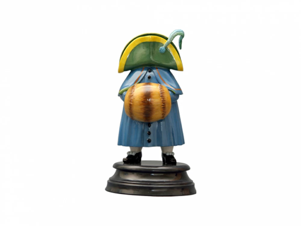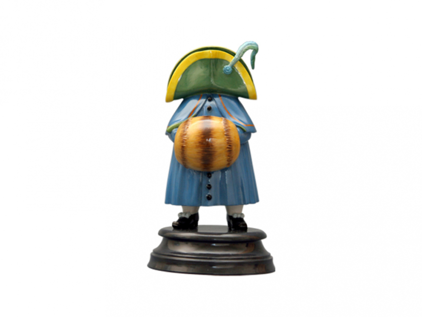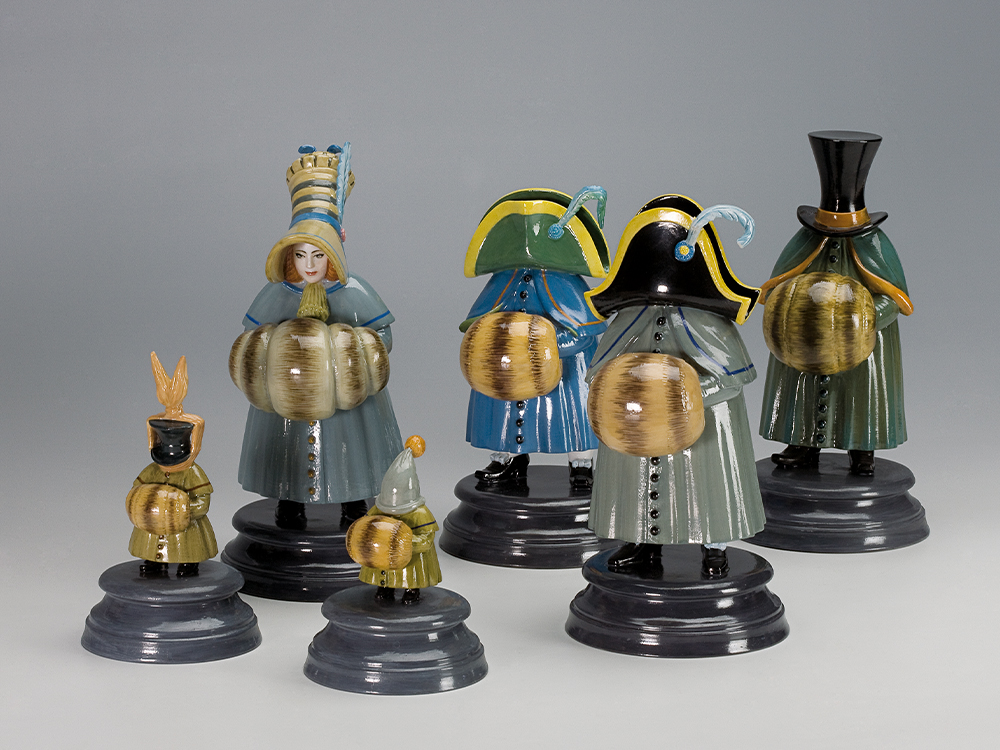 Роспись выполнена в технике надглазурной живописи надглазурными красками. Коллекция включает в себя 12 скульптур, из которых с первой по шестую – взрослые гости и с седьмой по двенадцатую – дети. Скульптура изображает гостя в синем плаще зеленой с желтой полосой по краю шляпе полукруглой формы. Руки гостя спрятаны в оранжевую с темными полосами муфту. Сзади поверх плаща из под шляпы свисает длинная косичка с голубым бантиком. Скульптура на постаменте в форме усеченного конуса с горизонтальным круговым рельефом. На дне постамента каждого гостя стоит название, надпись «Персонаж балета “Щелкунчик”», подпись Шемякина и клеймо «Орел»