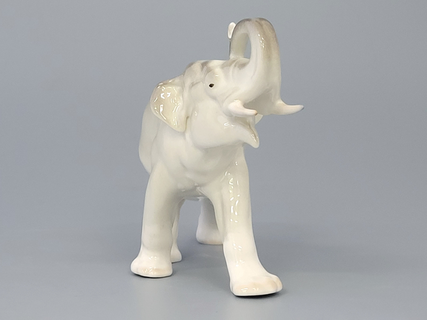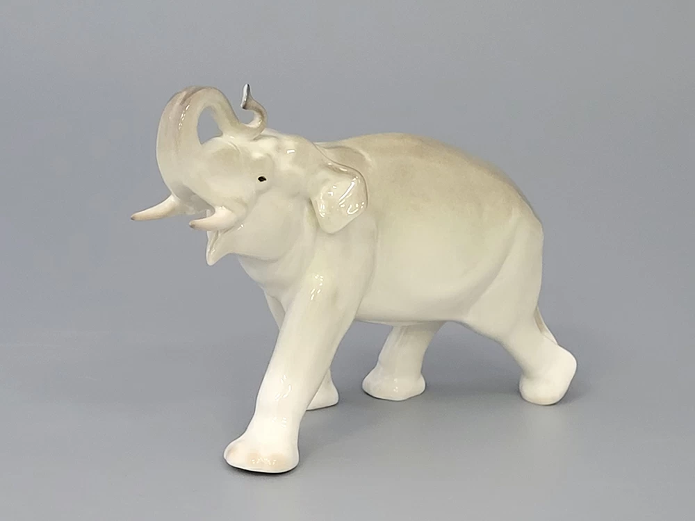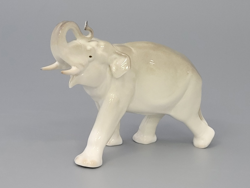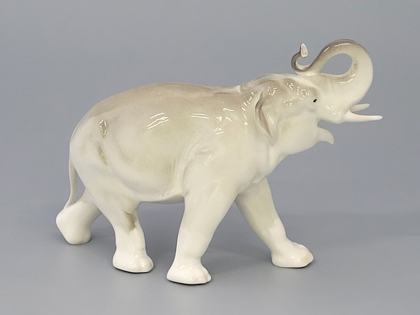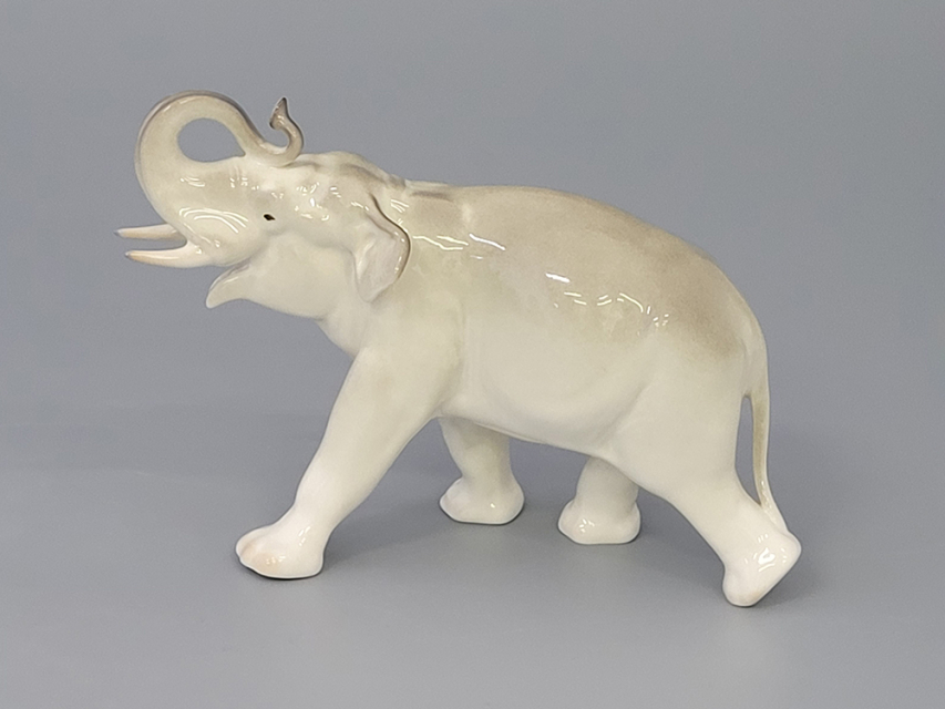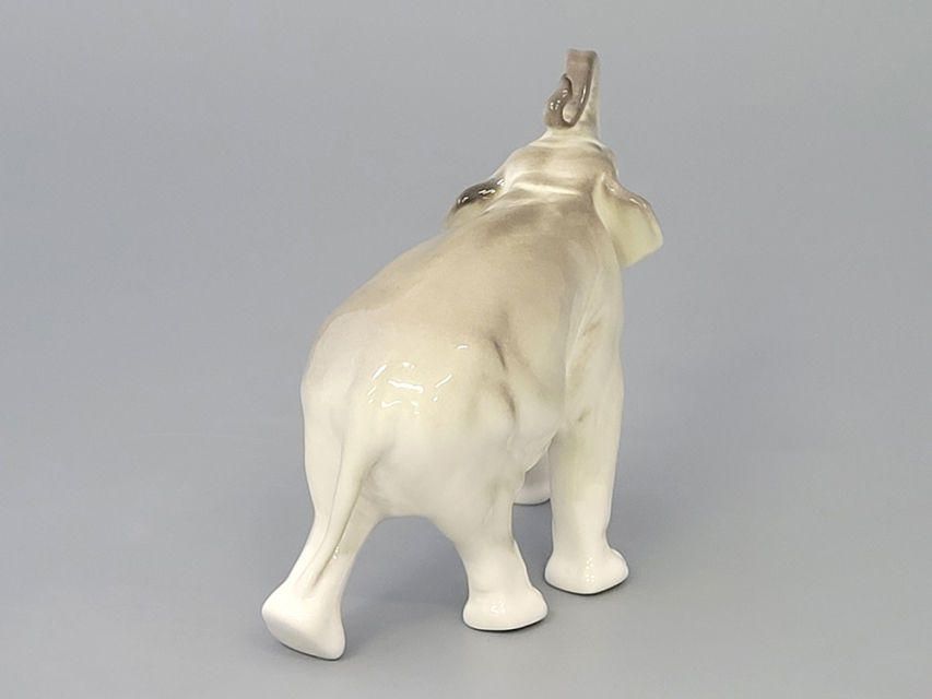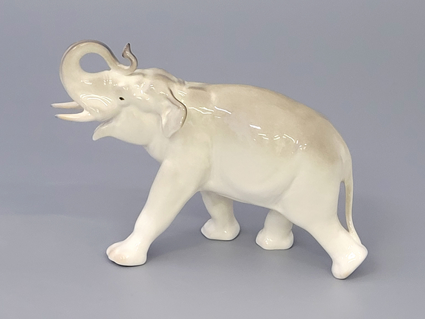 Скульптура Слон изготовлена на Императорском фарфоровом заводе из мягкого фарфора в технике ручной подглазурной росписи. Автор формы - Воробьев Б.Я. Высота скульптуры - 14,6 см. Скульптура "Слон" создана в 1954 году заслуженным художником РСФСР Воробьевым Борисом Яковлевичем.