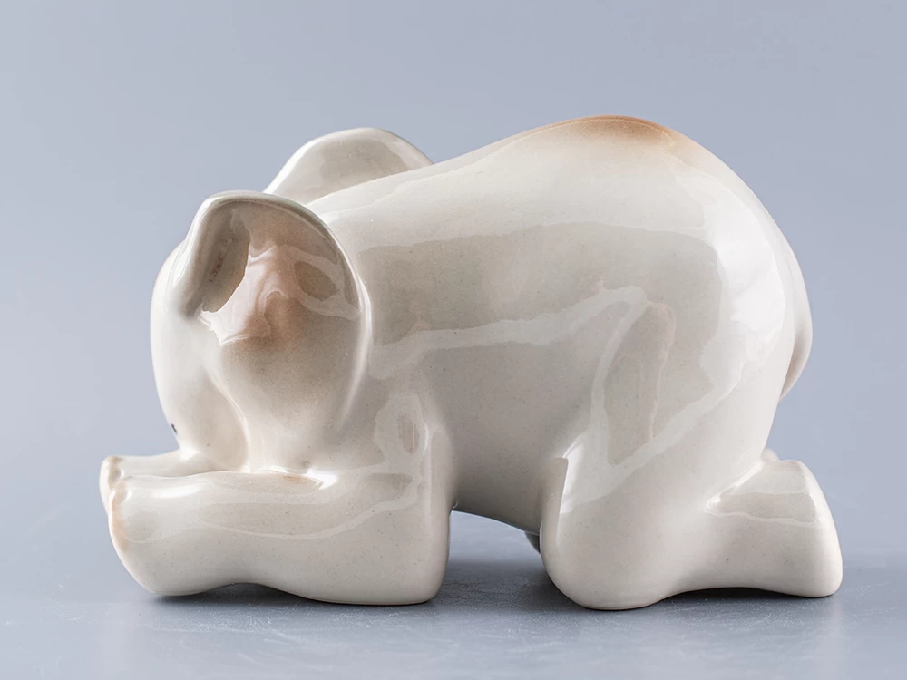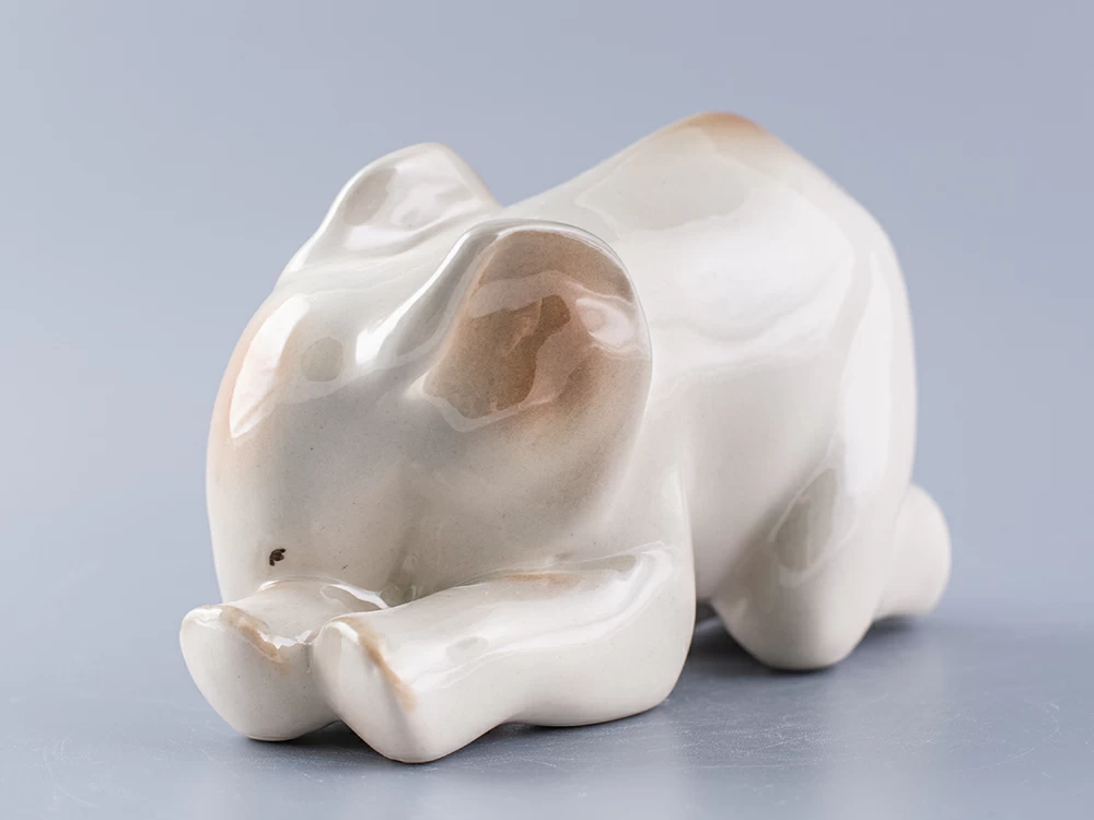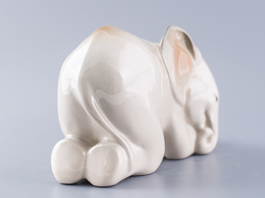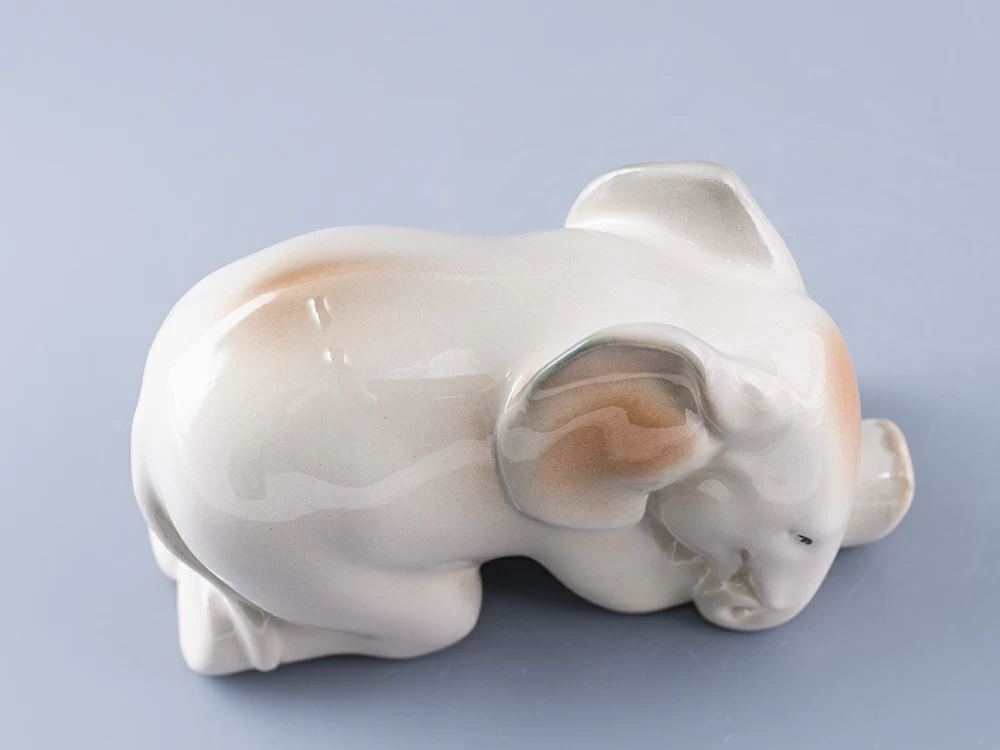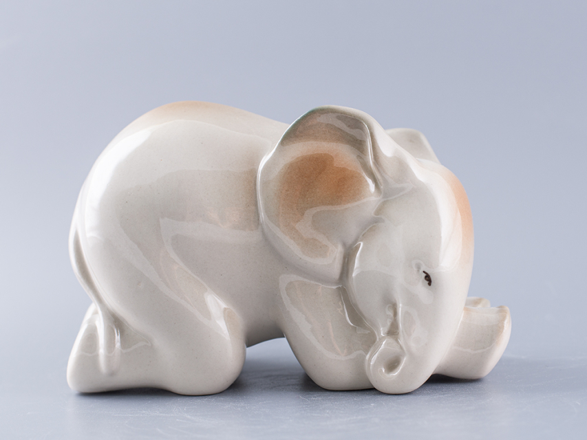 Скульптура Слоненок спящий изготовлена на Императорском фарфоровом заводе из мягкого фарфора в технике ручной подглазурной росписи. Автор формы - Веселов П.П. Высота скульптуры - 94 мм.