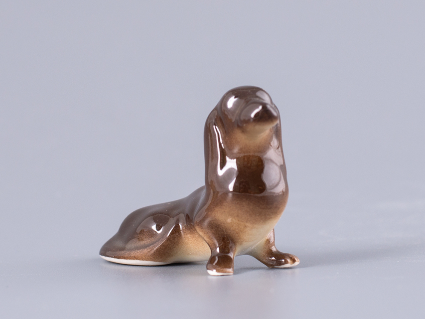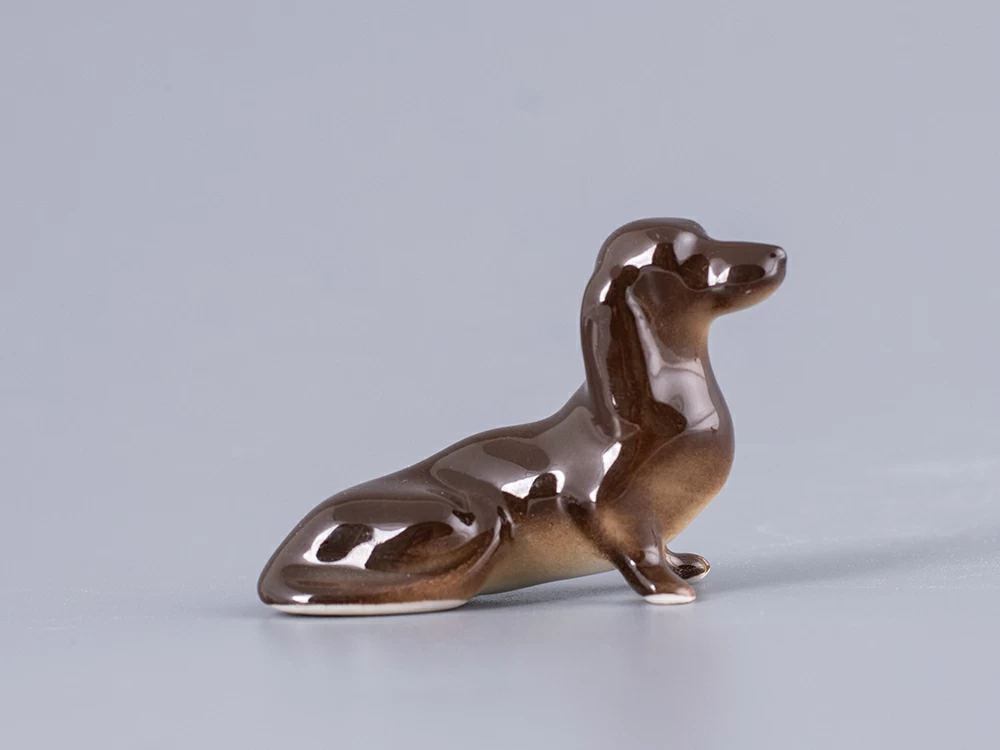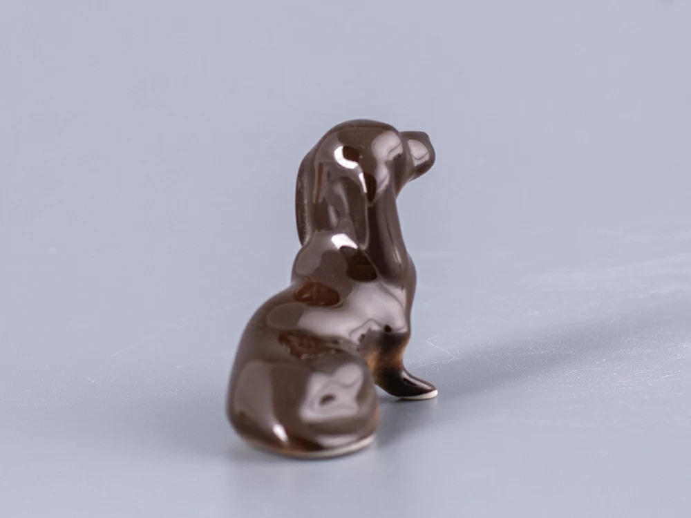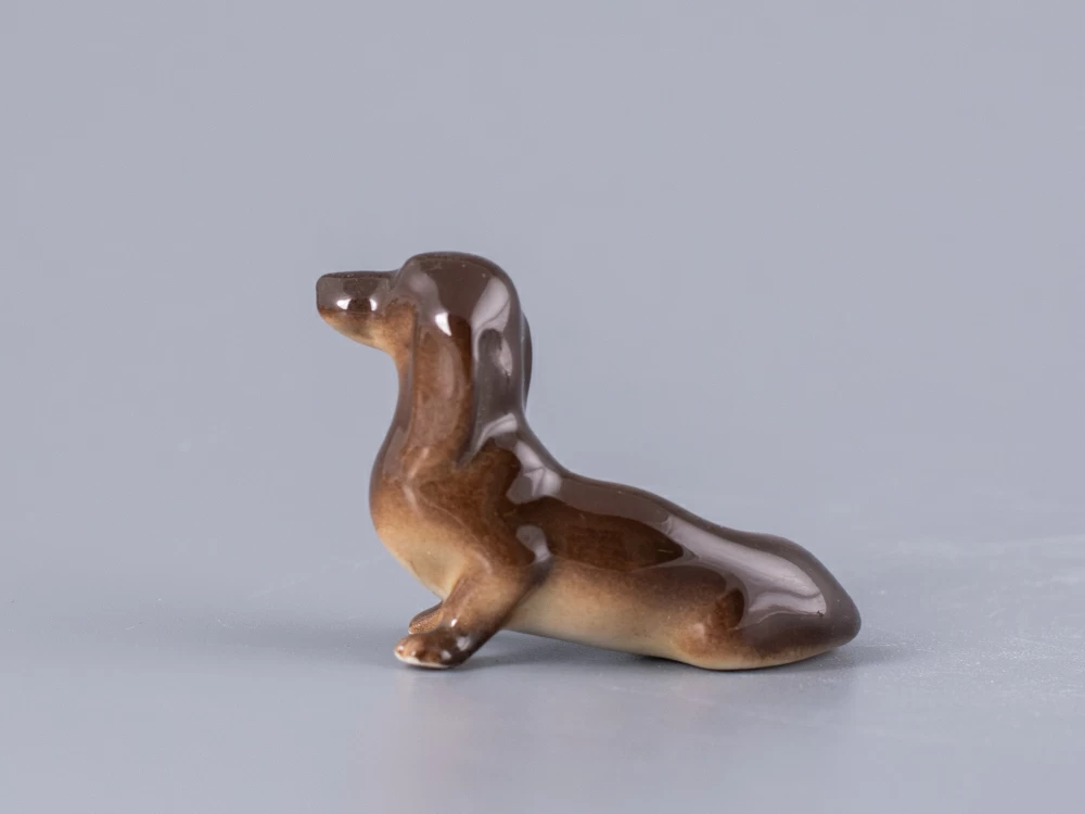 Скульптура Такса изготовлена на Императорском фарфоровом заводе из мягкого фарфора в технике ручной подглазурной росписи. Автор формы - Муратов Н.Е. Высота скульптуры - 35 мм.