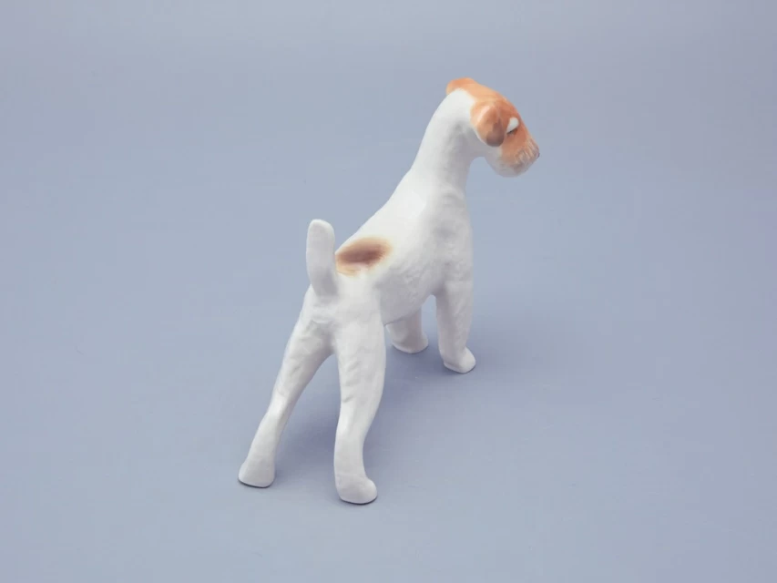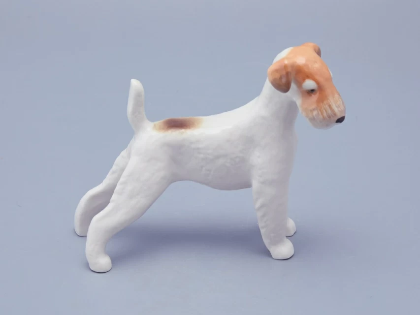 Скульптура Терьер жесткошерстный изготовлена на Императорском фарфоровом заводе из мягкого фарфора в технике ручной подглазурной росписи. Автор формы - Воробьев Б.Я. Высота скульптуры - 170 мм.