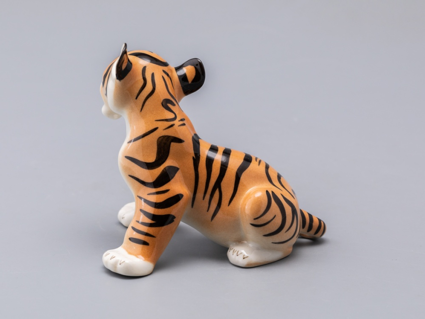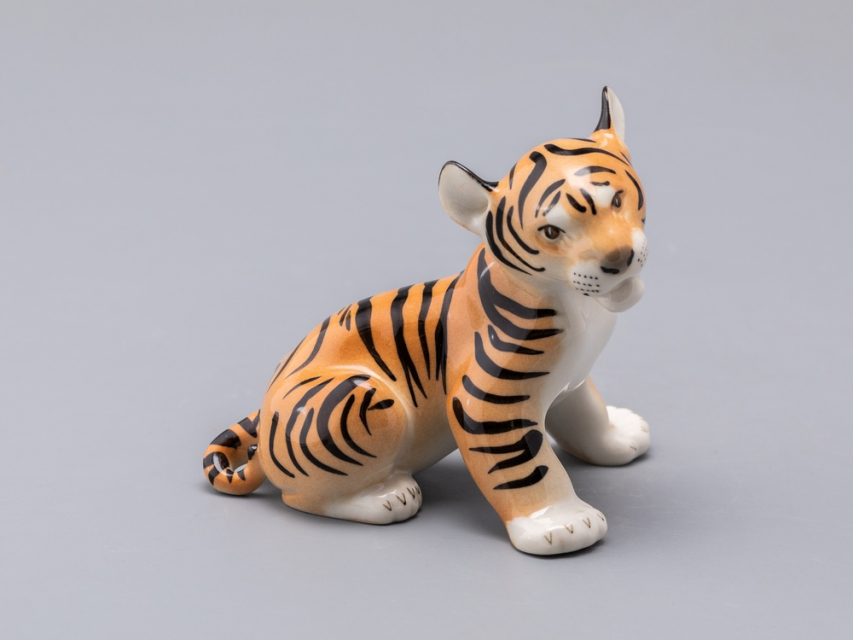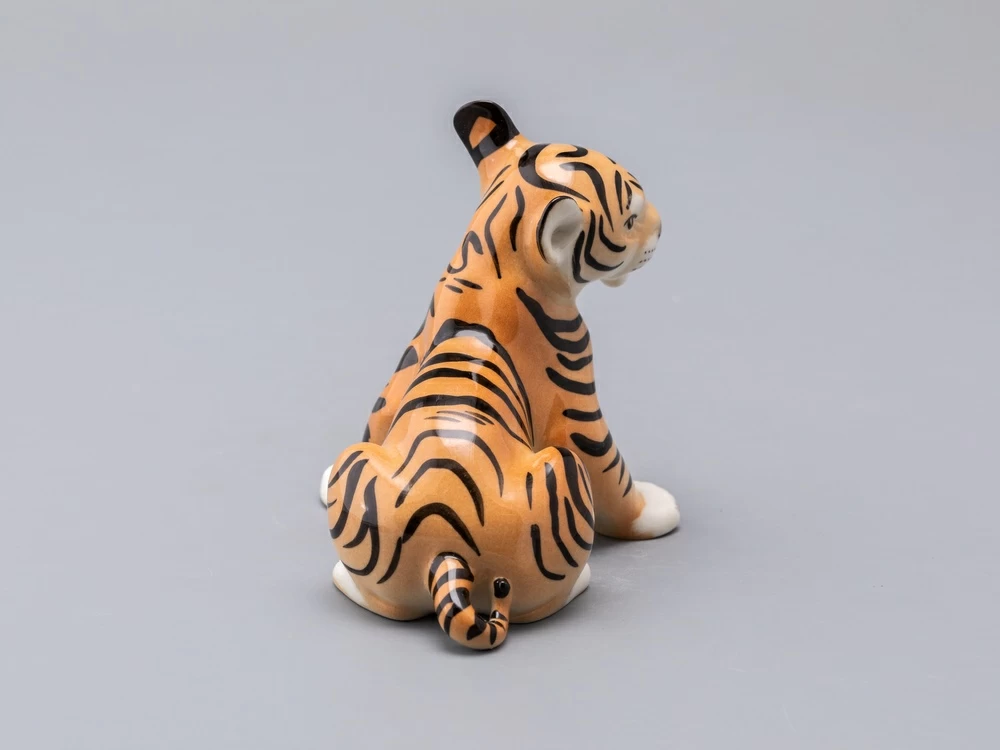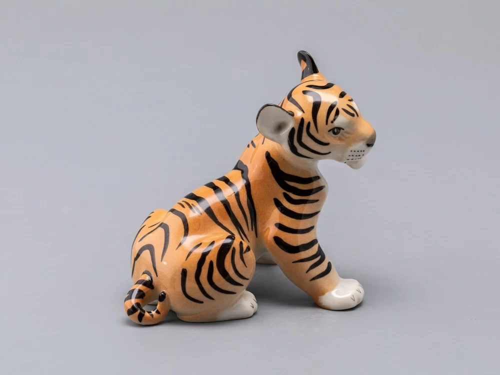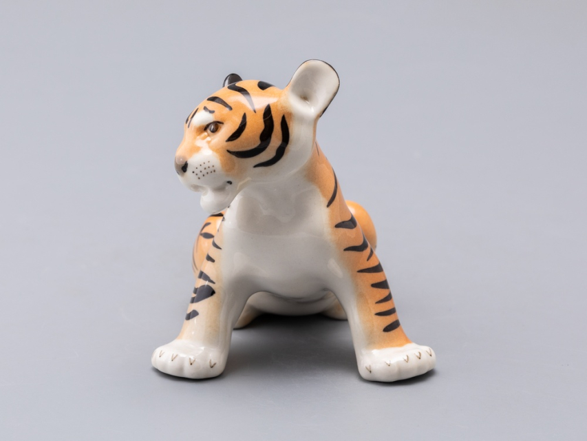Скульптура Тигренок изготовлена на Императорском фарфоровом заводе из мягкого фарфора в технике ручной подглазурной росписи. Автор формы - Воробьев Б.Я. Высота скульптуры - 127 мм. Скульптура "Тигренок" создана в 1954 году заслуженным художником РСФСР Воробьевым Борисом Яковлевичем.