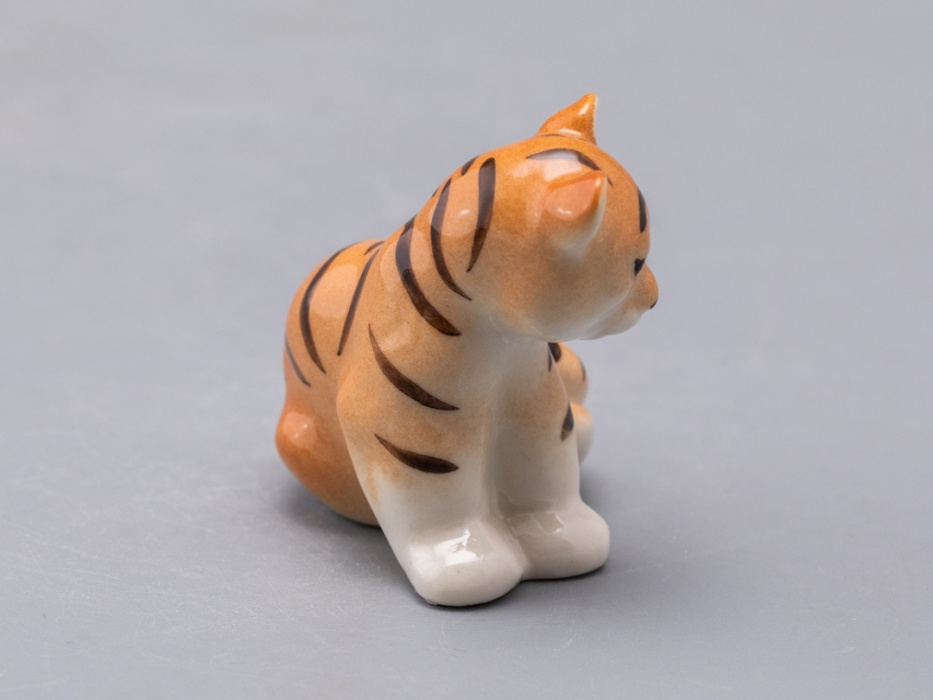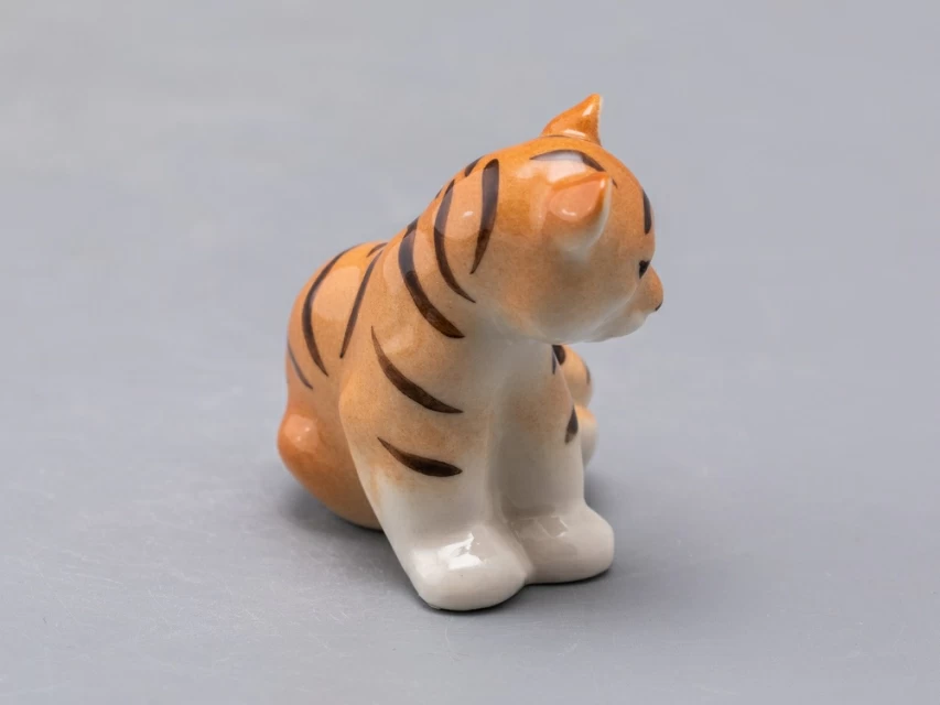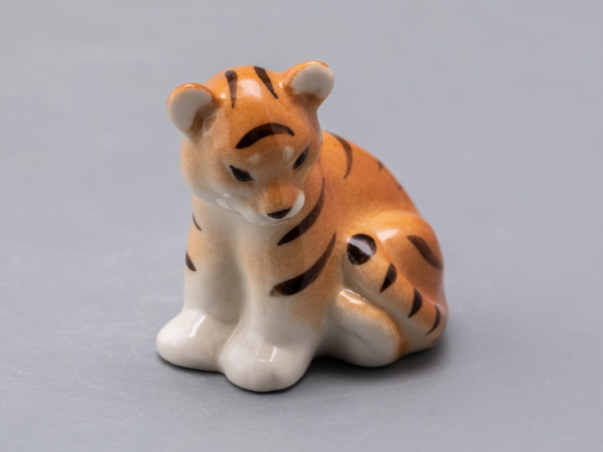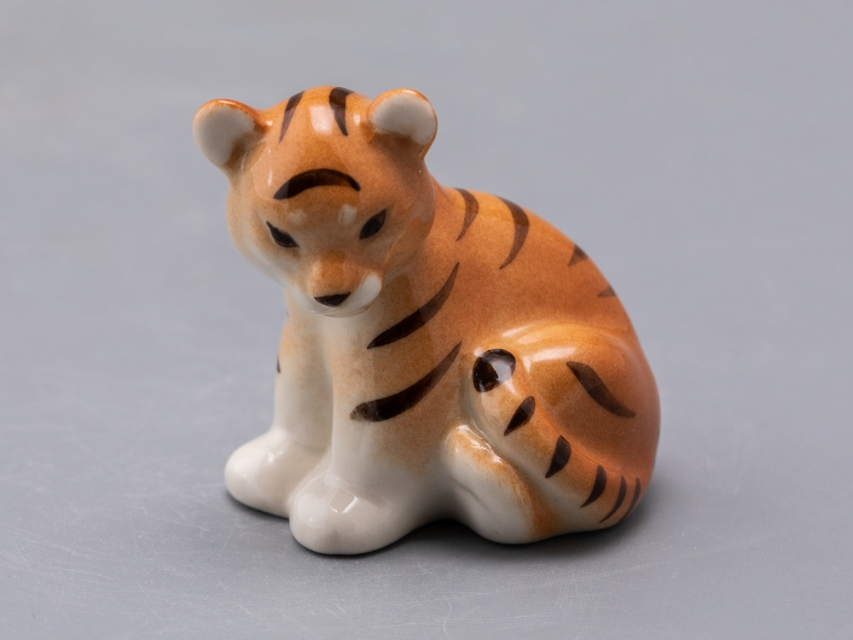 Скульптура Тигренок изготовлена на Императорском фарфоровом заводе из мягкого фарфора в технике ручной подглазурной росписи. Автор формы - Веселов П.П. Высота скульптуры - 52 мм.