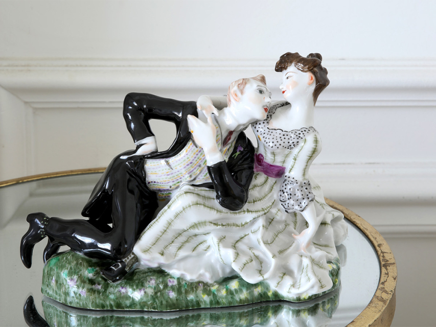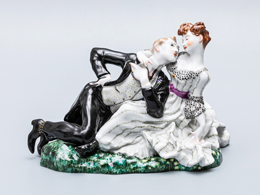 Роспись выполнена в технике надглазурной живописи надглазурными красками. Скульптурное изображение влюбленной пары на лужайке. На женщине платье с глубоким вырезом и длинной пышной юбкой; ворот платья и низ рукавом отделаны кружевами. На мужчине черный костюм и белый жилет. Скульптура подписная.