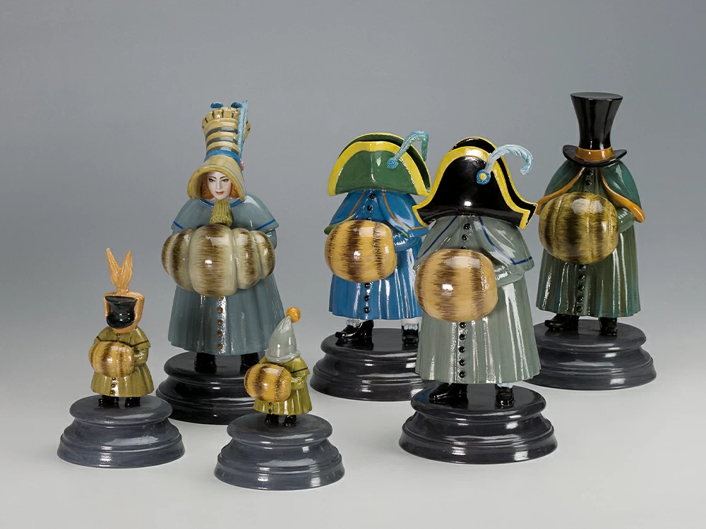 Роспись выполнена в технике надглазурной живописи надглазурными красками. Коллекция включает в себя 12 скульптур, из которых с первой по шестую – взрослые гости и с седьмой по двенадцатую – дети. Скульптура изображает даму в серо-зеленом плаще и желтой шляпке с пером и с голубыми полосками. На руках дамы бежевая с коричневыми полосами муфта. Скульптура на постаменте в форме усеченного конуса с горизонтальным круговым рельефом. На дне постаменте стоит название, надпись «Персонаж балета “Щелкунчик”», подпись Шемякина и клеймо «Орел»