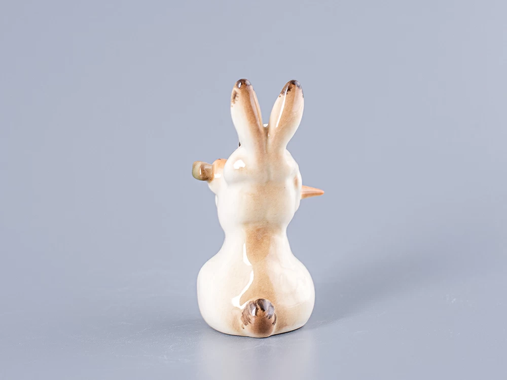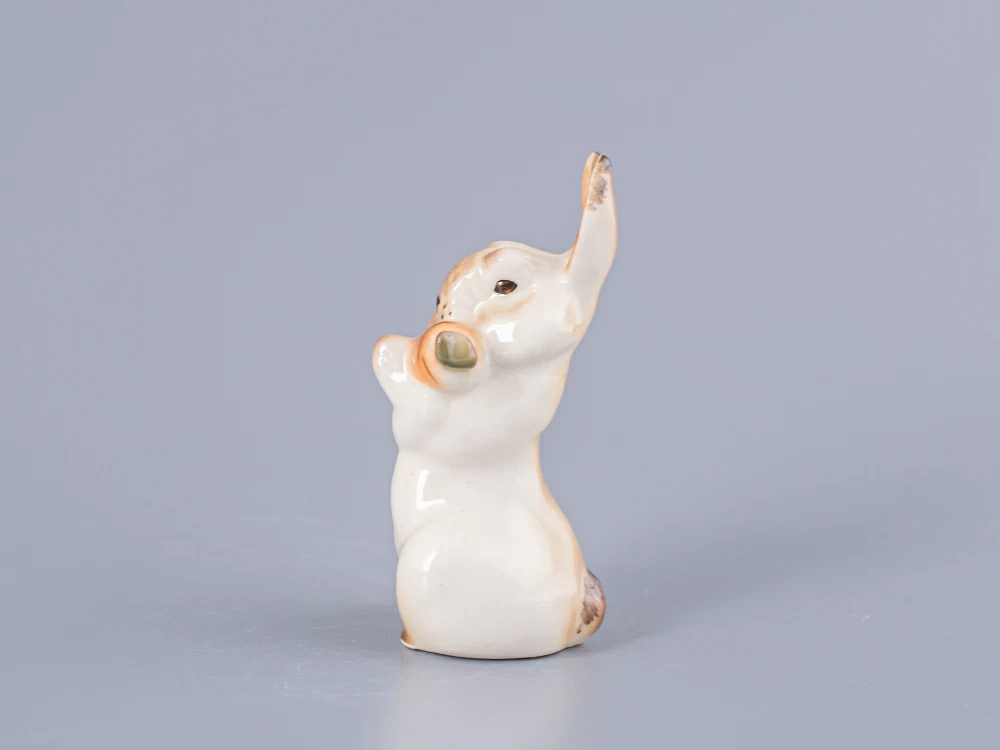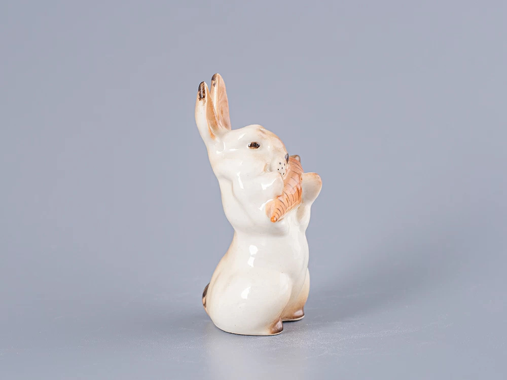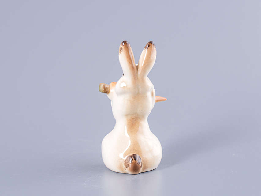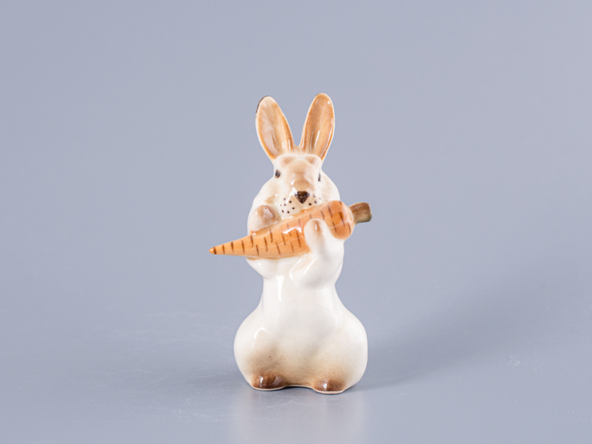 Скульптура Заяц с морковкой изготовлена на Императорском фарфоровом заводе из мягкого фарфора в технике ручной подглазурной росписи. Автор формы - Чарушин Е.Н. Высота скульптуры - 80 мм. Скульптура "Заяц с морковкой" создана в 1950 году Чарушиным Е.Н.