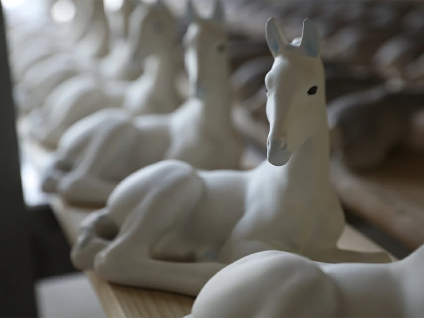 Скульптура «Жеребенок лежащий» изготовлена на Императорском фарфоровом заводе из мягкого фарфора в технике подглазурной росписи. Автор формы – скульптор Борис Яковлевич Воробьев, автор рисунка – художник Иван Иванович Ризнич. Изделие утверждено художественным советом в 1960-х годах, после чего начался серийный выпуск скульптуры. Скрупулёзное наблюдение за повадками представителей животного мира лежало в основе творчества Бориса Яковлевича Воробьёва, советского скульптора-анималиста, заслуженного художника РСФСР. Его колоссальный талант и невероятная наблюдательность проявляются даже в «лежащих» скульптурах. Каждый, кто знает и любит лошадей, кому довелось наблюдать за жеребёнком – то резвящимся, то устало засыпающим в траве, – легко узнает этот образ, воплощенный в фарфоре. Работы скульптора хранятся в фондах многих известных музеев, в частности, в Государственном Эрмитаже в Санкт-Петербурге, Государственной Третьяковской галерее, Государственном музее керамики и «Усадьбы Кусково XVIII в.», Государственном историко-архитектурном, художественном и ландшафтном музее-заповеднике «Царицыно». |