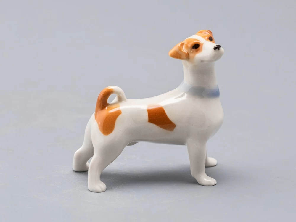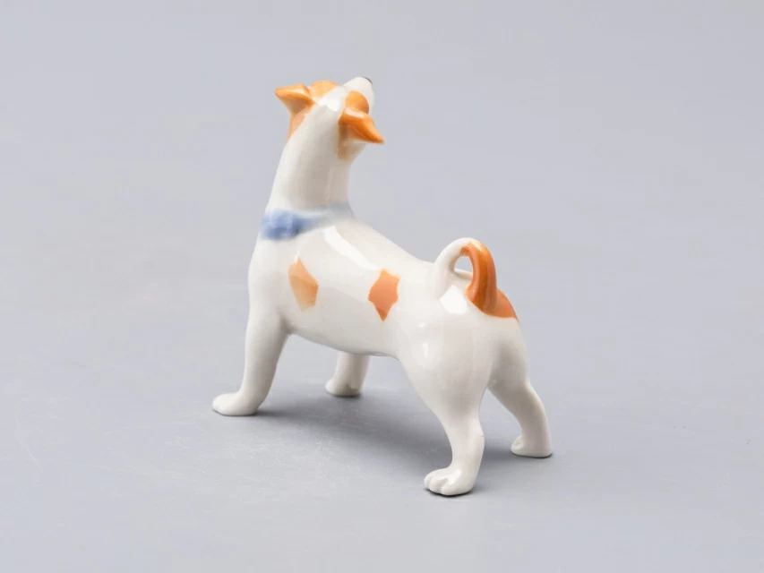 Скульптурное изображение стоящей на четырёх лапах собаки породы Джек-рассел-терьер. Голова животного повернута направо, хвост свёрнут колечком, не шее одет ошейник светло-голубого цвета.