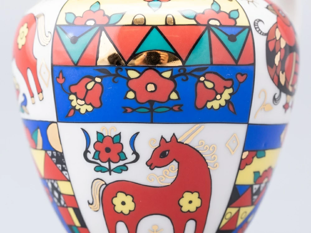 Роспись выполнена в технике надглазурной живописи надглазурными красками и золотом. Поверхность разделена на прямоугольники, в которых чередуются изображения фантастических животных и птиц с орнаментом из растительных и геометрических элементов. На носике и ручке сливочника широкая промазка золотом. Кистью вручную нанесена отводка золотом