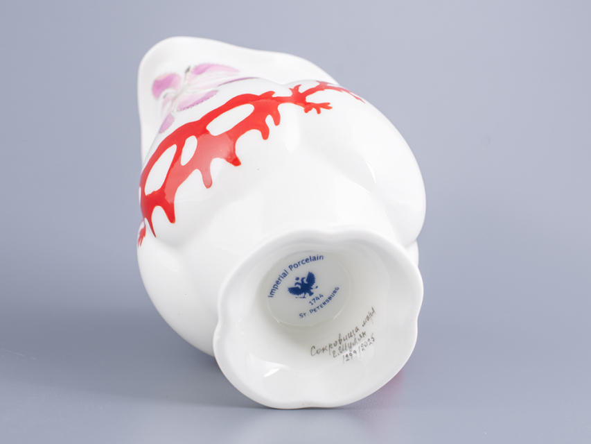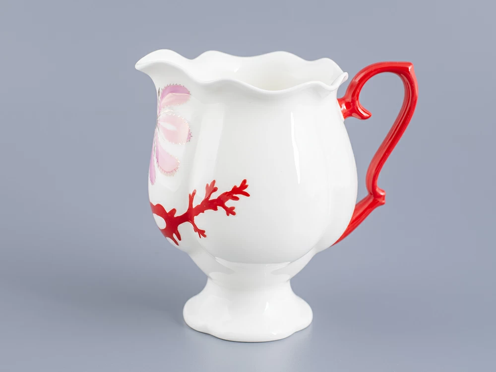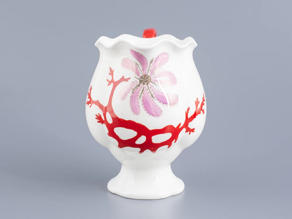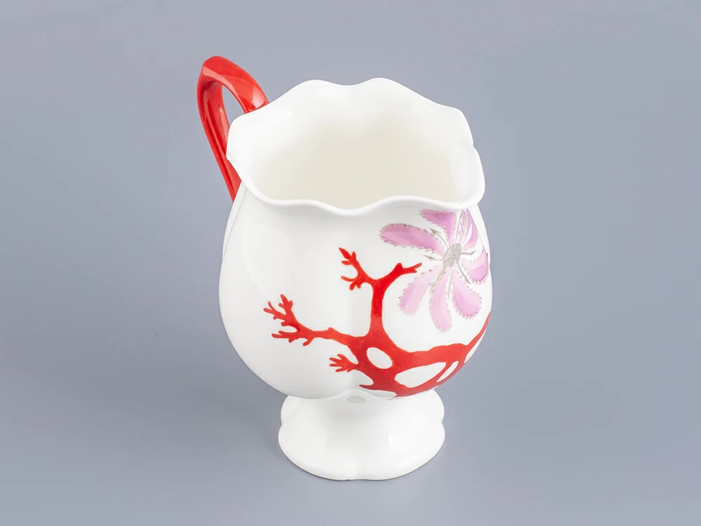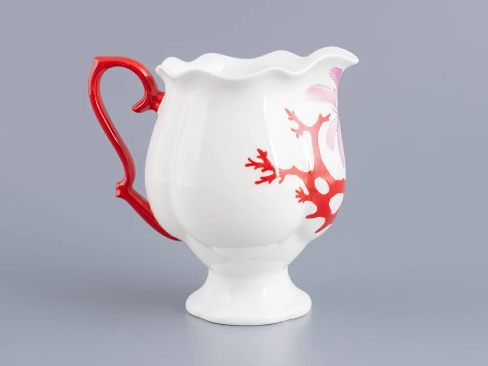 Сливочник «Сокровища моря» исполнен из тонкостенного костяного фарфора, от обычного его отличает повышенная белизна, тончайший слой глазури, и та воздушность, которая была свойственна знаменитому сорту старинного китайского фарфора под названием «яичная скорлупа». Изысканная роспись в исполнении заслуженного художника Галины Шуляк гармонично обыгрывает плавные очертания и изгибы формы. Ручки предметов стилизованы под коралл – прием, который автор почерпнул из истории фарфора. Роспись навеяна впечатлениями от растительного и животного мира Красного моря. Яркий окрас коралловых нитей, смягченный полупрозрачными силуэтами морских звезд и раковин, выгодно подчеркивает достоинства материала.