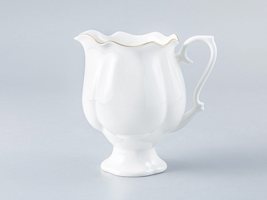 Сливочник выполнен из уникального костяного тонкостенного фарфора, изобретенного на ИФЗ в 60-х годах XX века. По белизне, тончайшему слою глазури и воздушности он более всего напоминает сорт старинного китайского фарфора «яичная скорлупа». Изысканная отводка, нанесенная натуральным золотом, деликатно обыгрывает белоснежную поверхность изделий, дополняет легкий, светлый образ, подчеркивает хрупкость материала, изящную форму предметов и благородство фарфорового ансамбля.