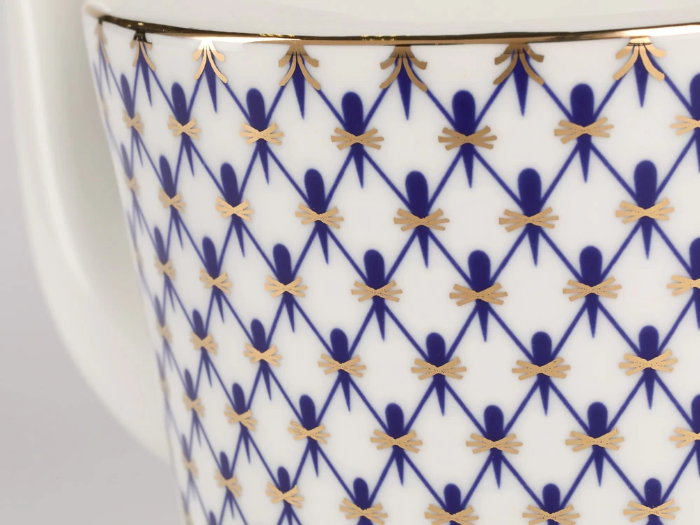 Роспись выполнена в технике подглазурной живописи кобальтовыми красками с последующей ручной доделкой золотосодержащим препаратом. По тулову всех предметов, по борту блюдец и на крышках от сахарницы и кофейника в сплошном заполнении сетчатый кобальтовый фриз и по нему фриз из мелких золотых «жучков». Кистью вручную нанесены отводки золотосодержащим препаратом по верхнему краю рисунка, по краю и по ножке предметов (на кофейнике, сливочнике, чашке, сахарнице), по краю блюдца, а так же по носику кофейника и на держателях крышек.