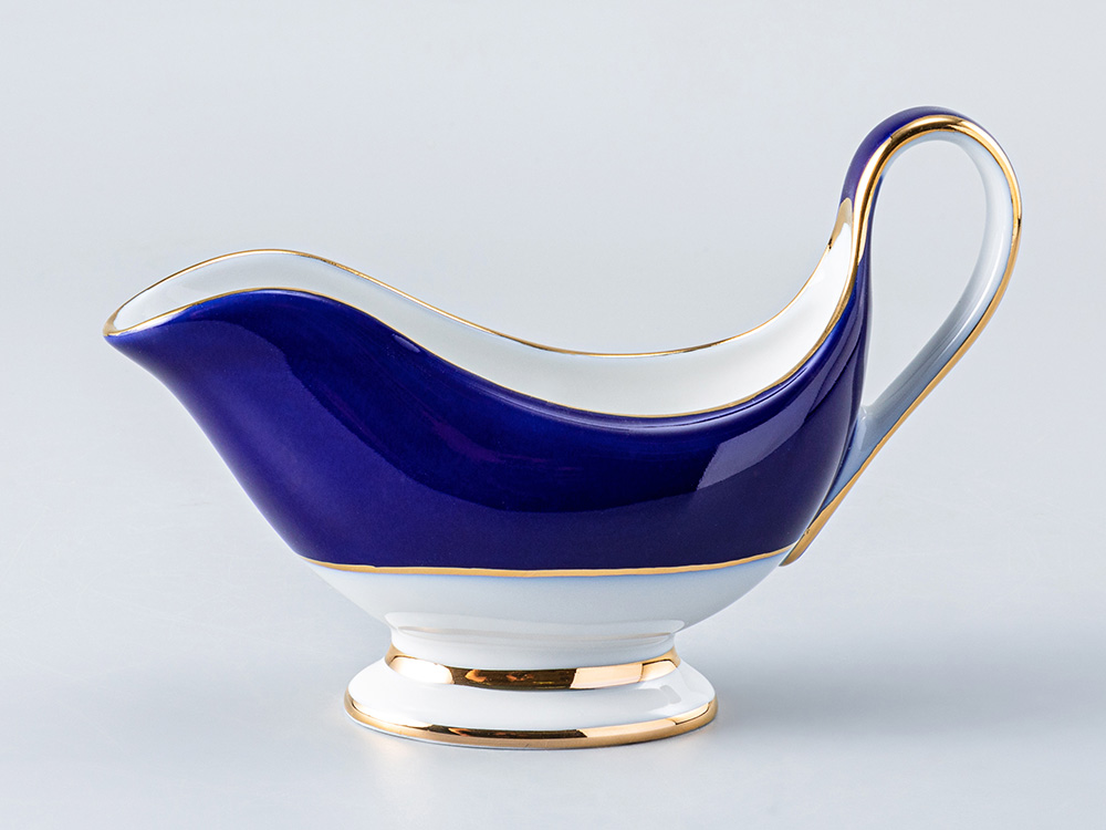 Роспись выполнена в технике подглазурной живописи кобальтовой краской с последующей ручной доделкой золотосодержащим препаратомПо борту соусников и по ручке в сплошном заполнении кобальтовая краска, по краям соусника, ручки и ножки широкая отводка золотосодержащим препаратом.