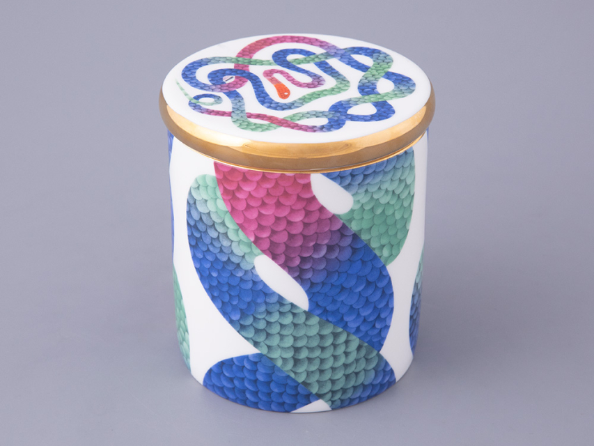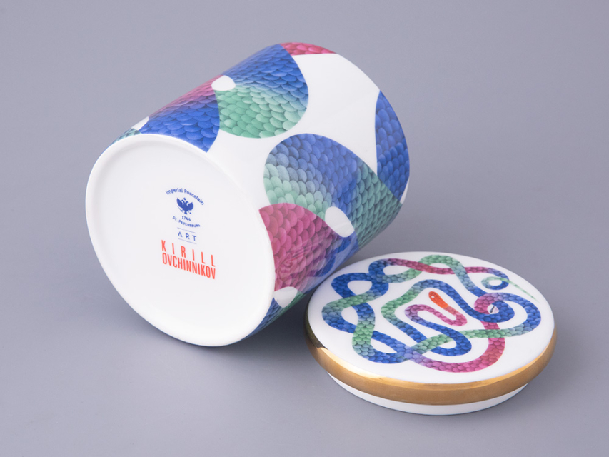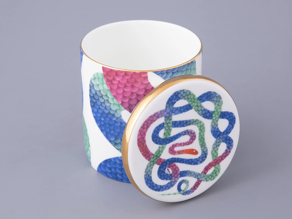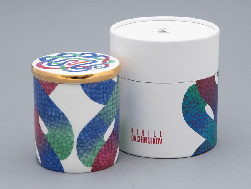 Ароматическая свеча с декором «Лунный змей» вошла в эксклюзивную серию с рисунками известного российского дизайнера Кирилла Овчинникова. В дизайне свечи Кирилл Овчинников обращается к любимой им теме мифологических сюжетов. С одной стороны, змей на фарфоре напоминает загадочного Уробороса. С другой – «Лунный змей» необыкновенно прекрасен. Он переливается в лунном свете и переносит в особенный, фантастический мир. В дизайне Кирилл Овчинников использует необычные цветовые сочетания, которые создают восхитительный контраст с костяным фарфором.
