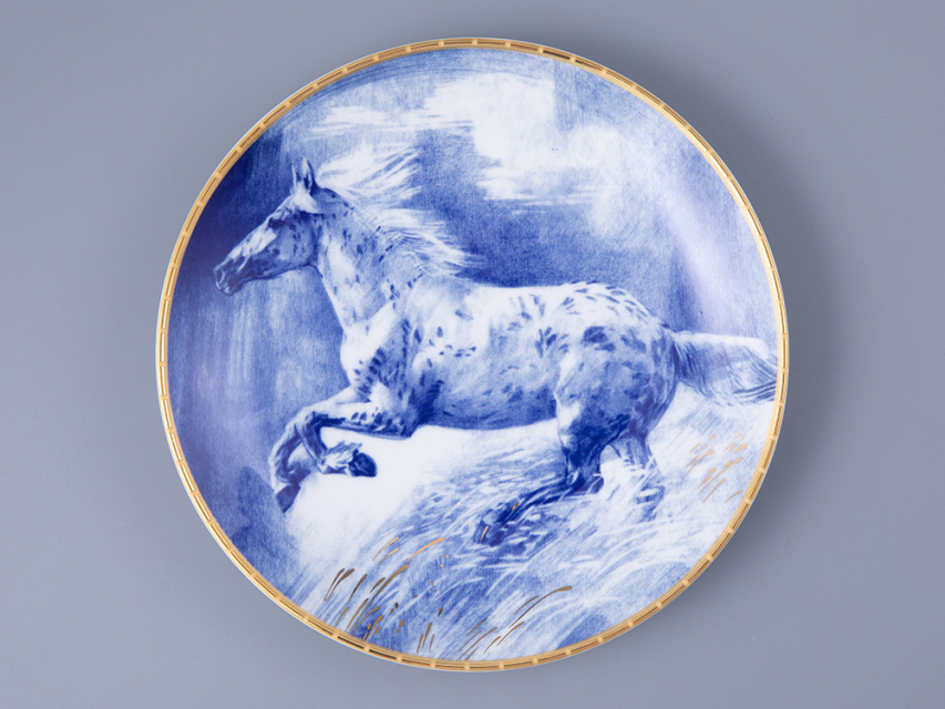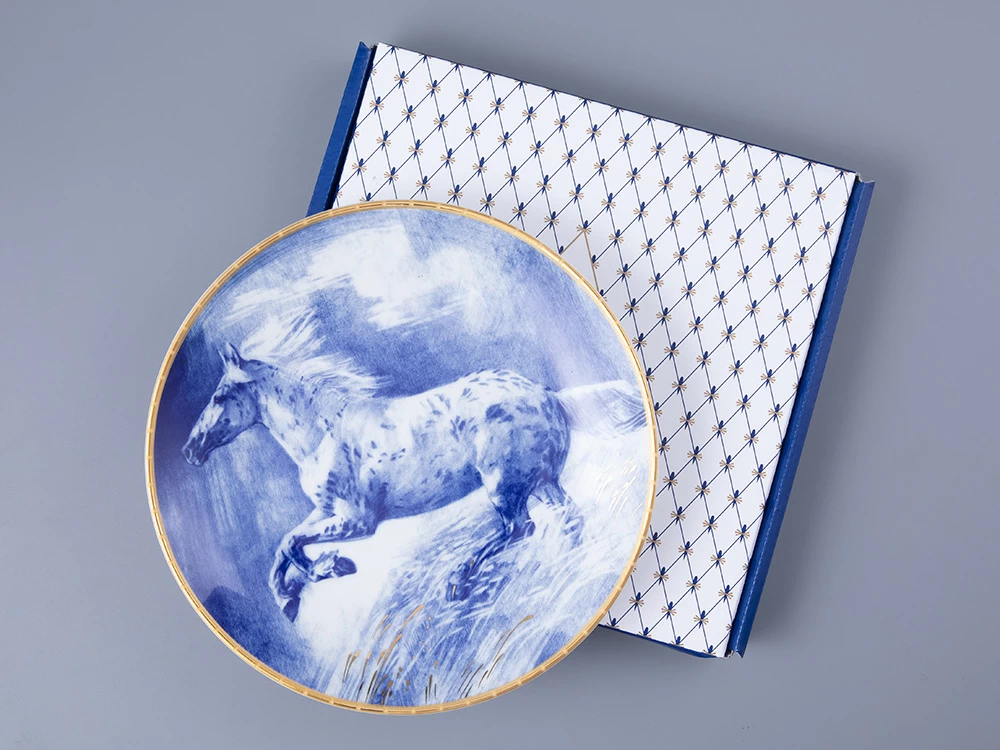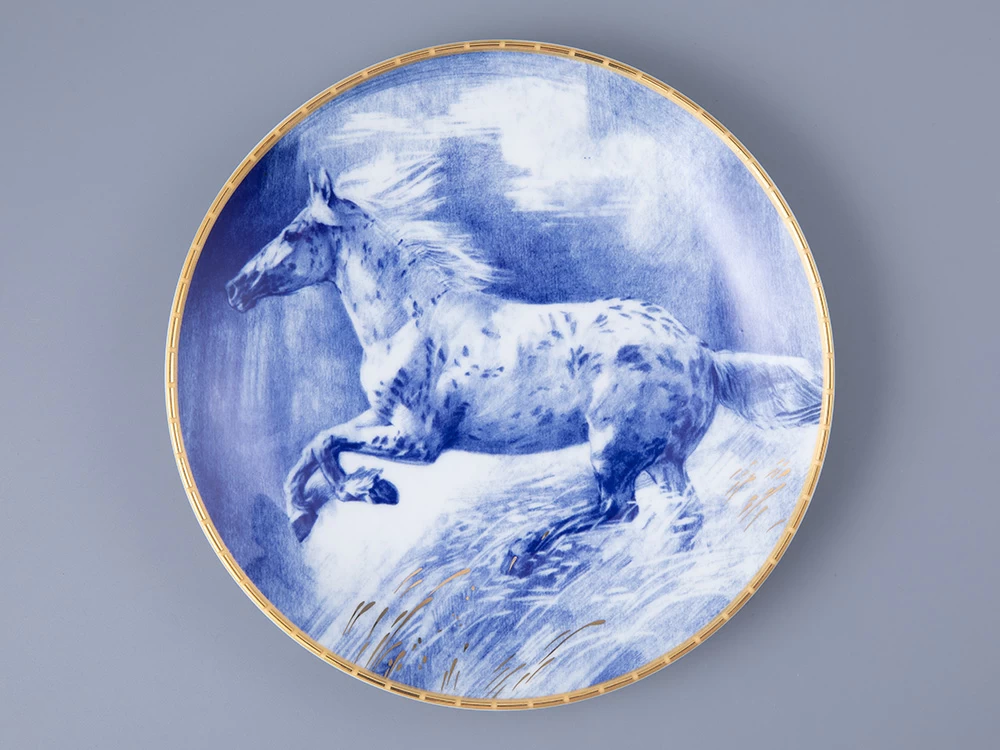 Неповторимую грацию и жизненную энергию лошади отобразила на декоративной тарелке Нелли Петрова. Автор подчеркивает мощь и силу животного, тщательно прорисовывая мельчайшие детали экстерьера. При этом Нелли Петрова не забывает о балансе: художник использует сдержанную цветовую палитру, где каждый полутон продуман и гармоничен, где игра света и тени создает объем и динамику, делает рисунок живым и выразительным. Название рисунка «Алмаз» выбрано художником не случайно. Как драгоценный минерал, обладает множеством оттенков, так и изображенная на фарфоре лошадь горделиво демонстрирует собственный уникальный окрас. Завершенность рисунку придает использование натурального золота. Такая декоративная тарелка прекрасно впишется в праздничную атмосферу, напомнит о мечтах и стремлениях, которые захочется воплотить в новом году.
