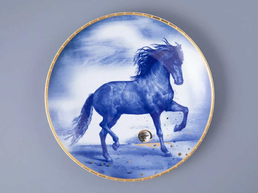 Неповторимую грацию и жизненную энергию лошади отобразила на декоративной тарелке Нелли Петрова. Автор подчеркивает мощь и силу животного, тщательно прорисовывая мельчайшие детали экстерьера. При этом Нелли Петрова не забывает о балансе: художник использует сдержанную цветовую палитру, где каждый полутон продуман и гармоничен, где игра света и тени создает объем и динамику, делает рисунок живым и выразительным. Автор не случайно дает рисунку название «Пепел», сравнивая масть лошади именно с его насыщенным цветом. Завершенность рисунку придает использование натурального золота. Такая декоративная тарелка прекрасно впишется в праздничную атмосферу, напомнит о мечтах и стремлениях, которые захочется воплотить в новом году.