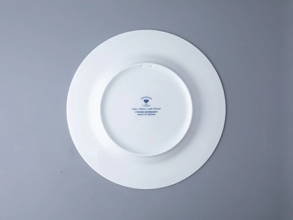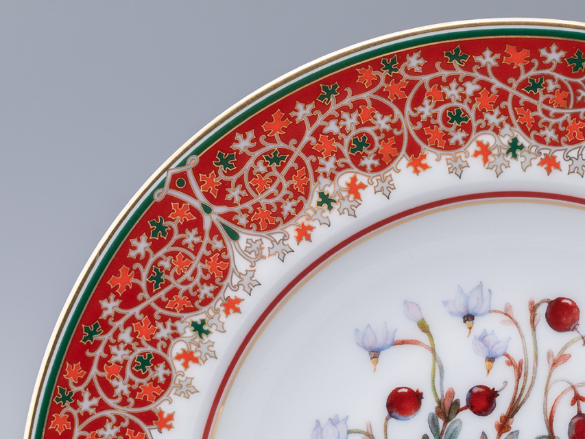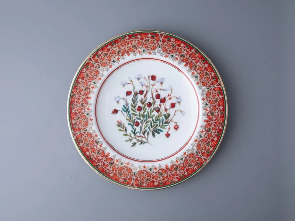 Клюква – ягода, известная своими уникальными целебными свойствами. А еще клюква – настоящий символ щедрости северных земель России. Яркая ягода рубинового цвета занимает особое место в культуре и традициях народов нашей страны, вызывает ассоциации с первозданной природой и красотой родных просторов. Декоративная тарелка «Клюква заповедная» вошла в продолжение коллекции «Цветы и ягоды России» от художника Ольги Будашовой. В своих работах автор зачастую изображает цветы и дары природы, – такой декор остается вне времени. Используя растительные мотивы, Ольга Будашова создает предметы, которые сочетают в себе искусство и практичность. Композиция на фарфоре, выполненная в эстетике винтажных ботанических иллюстраций, дополнена орнаментальным узором – авторским размышлением на тему национальной вышивки.