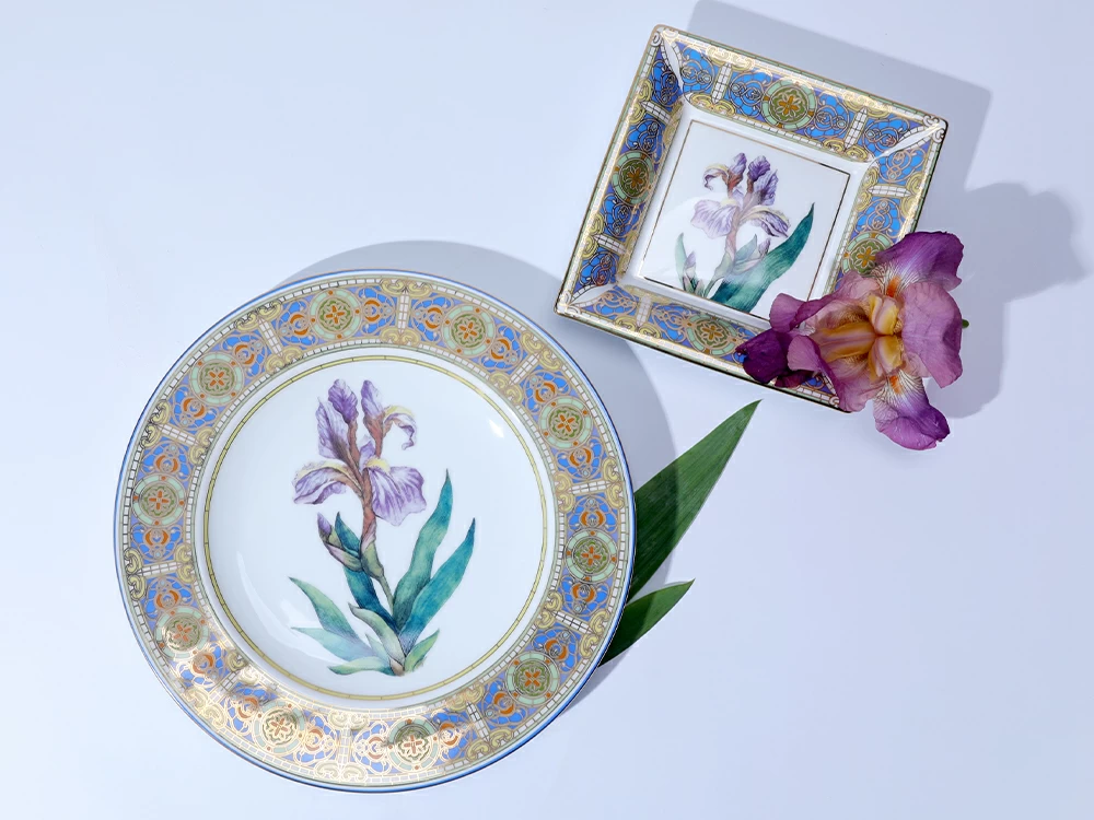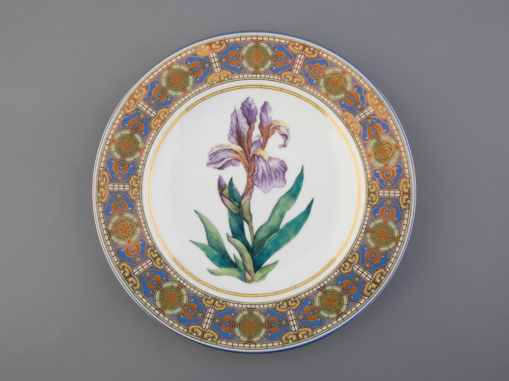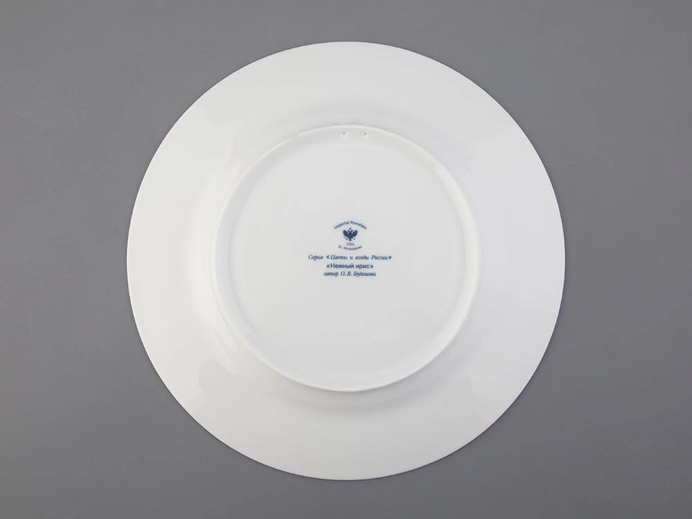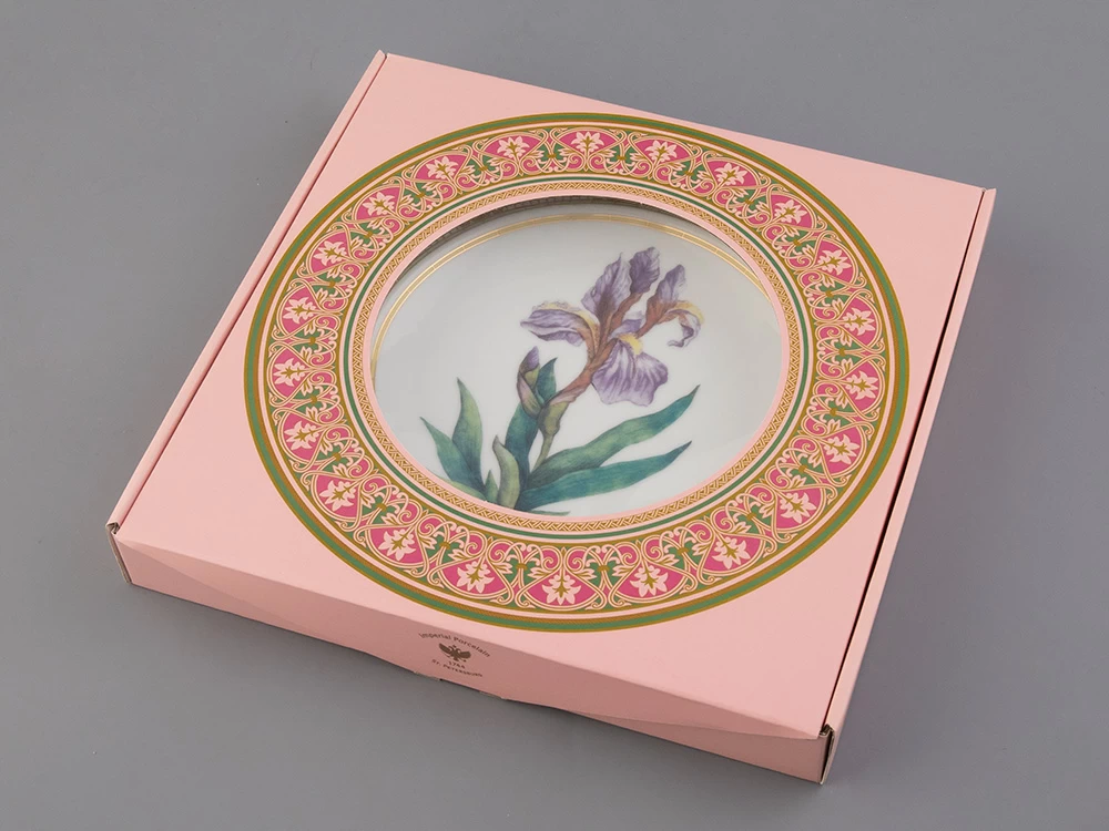 В нашей стране встречается несколько десятков сортов прекрасного ириса. Бутоны его бывают самых разных оттенков: от ослепительно-белых до чернильно-фиолетовых. Расцветка ириса, изображенного на тарелке, более привычна для наших широт. Пышные лепестки фиолетового цвета символизируют интеллект, благородство и уважение. Декоративная тарелка с нежным ирисом вошла в коллекцию «Цветы и ягоды России». Композиция на фарфоре, выполненная в эстетике винтажных ботанических иллюстраций, дополнена орнаментальным бортом. Рисунок представляет собой авторское размышление на тему национальной вышивки.