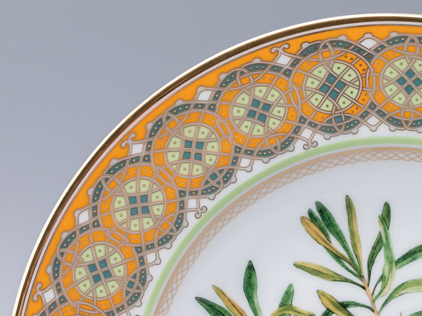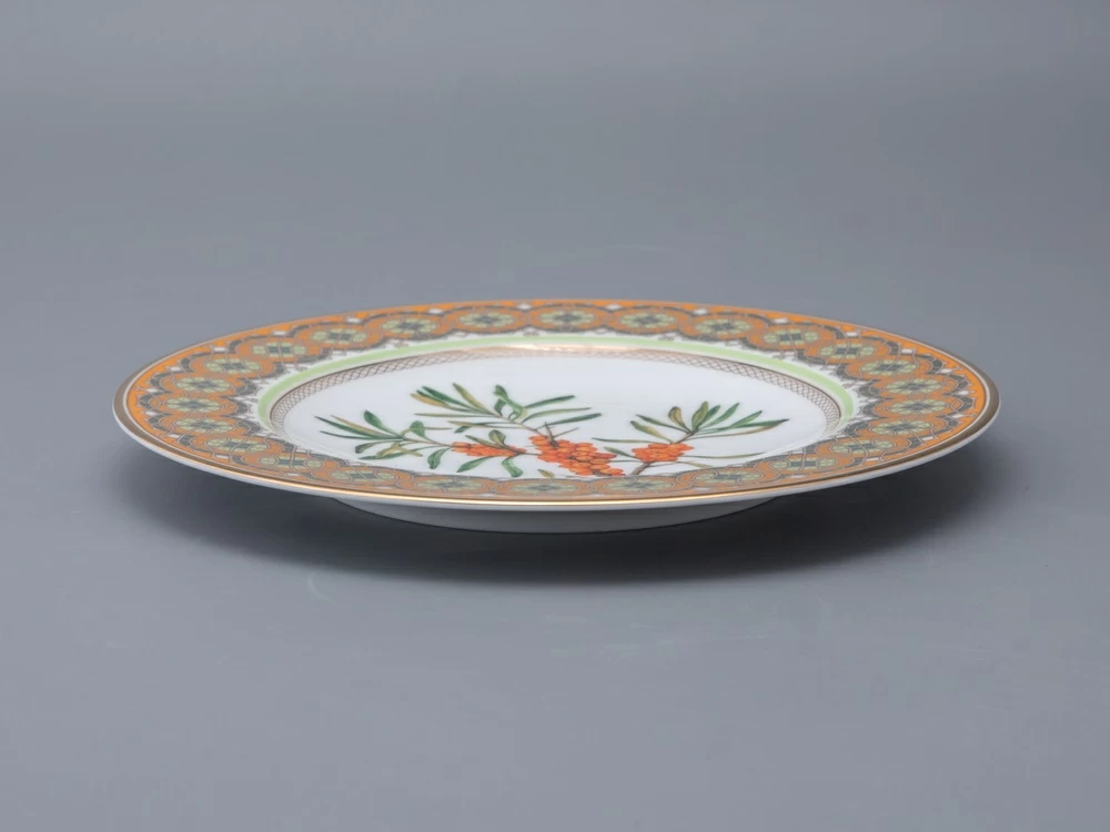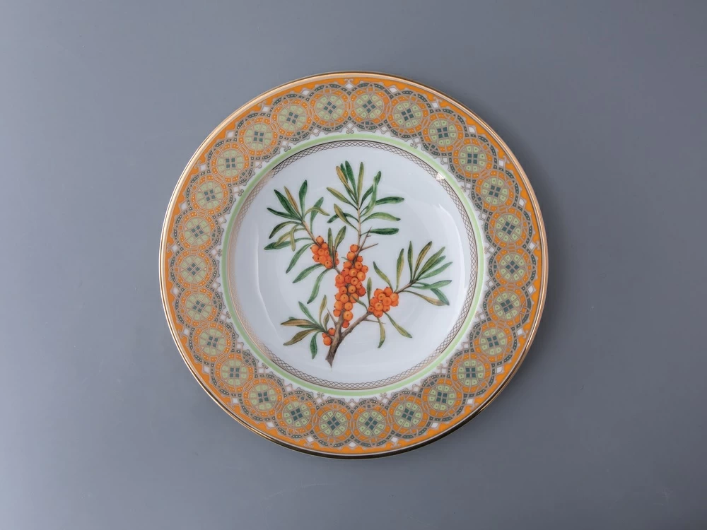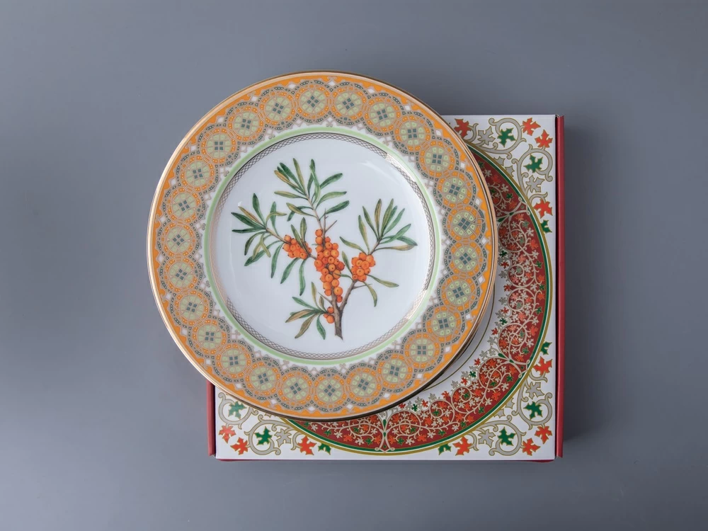 Облепиха сибирская – настоящая драгоценность в природной сокровищнице сурового Урала и Сибири. Облепиха знаменита своими полезными плодами яркого золотистого цвета, которые укрепляют здоровье и восстанавливают жизненную энергию. Эти солнечные ягоды стали символом изобилия, благополучия и усердия. А в славянских традициях облепиха считается символом удачи и процветания. Декоративная тарелка «Облепиха сибирская» вошла в продолжение коллекции «Цветы и ягоды России» от художника Ольги Будашовой. В своих работах автор зачастую изображает цветы и дары природы, – такой декор остается вне времени. Используя растительные мотивы, Ольга Будашова создает предметы, которые сочетают в себе искусство и практичность. Композиция на фарфоре, выполненная в эстетике винтажных ботанических иллюстраций, дополнена орнаментальным узором – авторским размышлением на тему национальной вышивки.