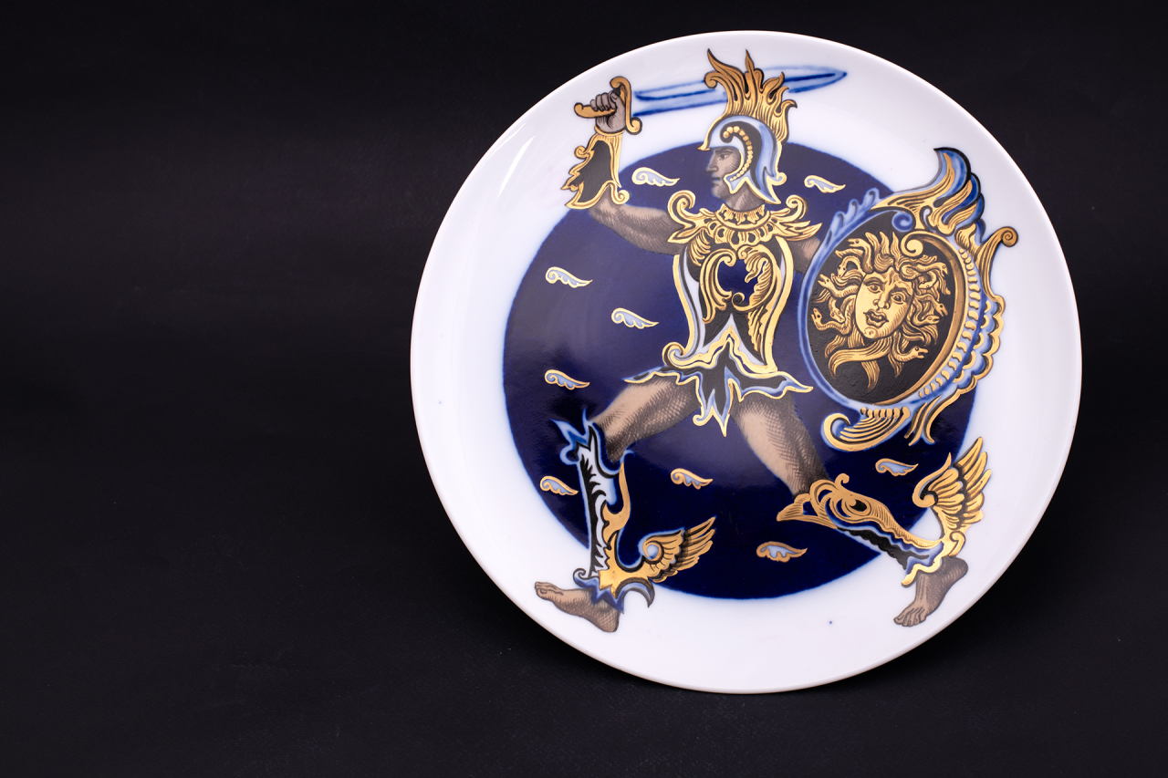 Декоративная тарелка в росписи известного петербургского графика Игоря Ганзенко представляет собой современное прочтение античного мифа о Персее. В центре композиции, на фоне кобальтового диска, изображена динамичная фигура героя, облаченного в золоченые доспехи. Особое внимание привлекает детальная проработка щита с ликом Медузы Горгоны и крылатых сандалий, выполненных с ювелирной точностью. Сочетание строгого графичного штриха, благородного синего цвета и сияющего золота придает изделию особый героический пафос. Эта работа станет безупречным акцентом в классическом интерьере, воплощая в себе силу, мужество и победу духа.