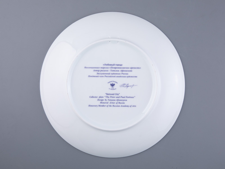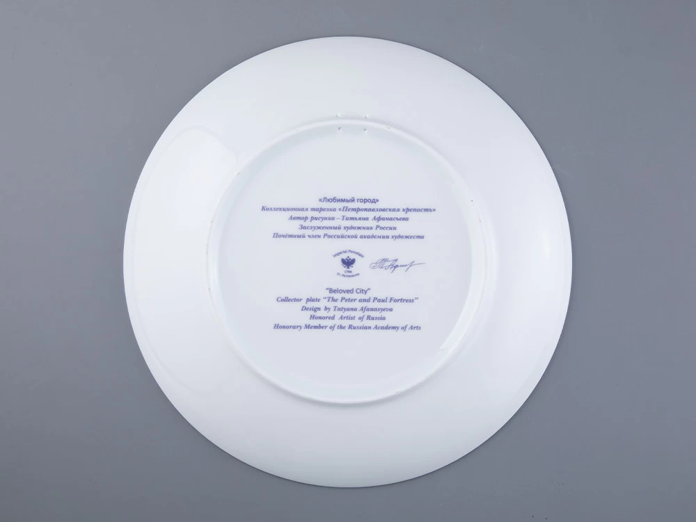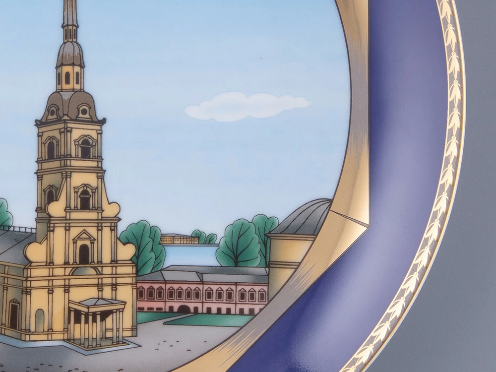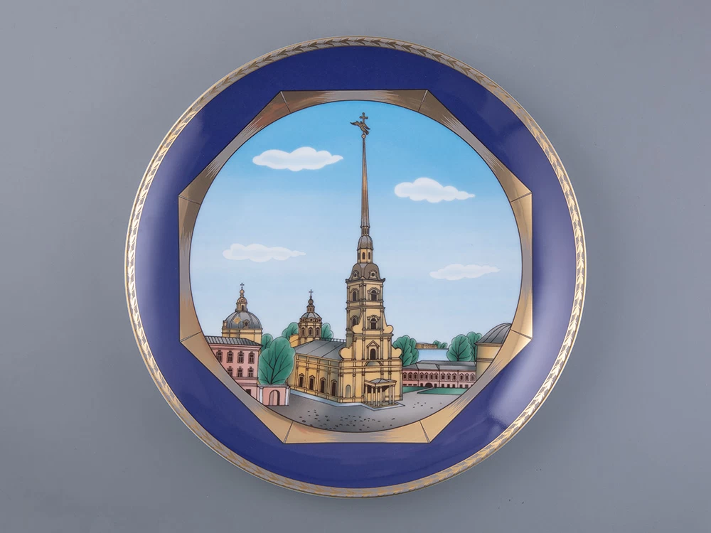 Декоративная тарелка вошла в серию фарфора, посвященную Санкт-Петербургу. На тарелке изображена Петропавловская крепость, а именно, ее сердце – собор Святых апостолов Петра и Павла. Этот шедевр петровского барокко является одним из главных символов города, восхищает своей величавостью, торжественностью и красотой. В декоре автор намеренно использует активный кобальт и вписывает достопримечательность в золотое обрамление, проводя параллель с выдающейся коллекцией «Классика Петербурга» Галины Шуляк.