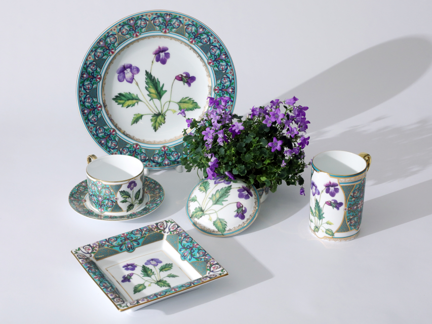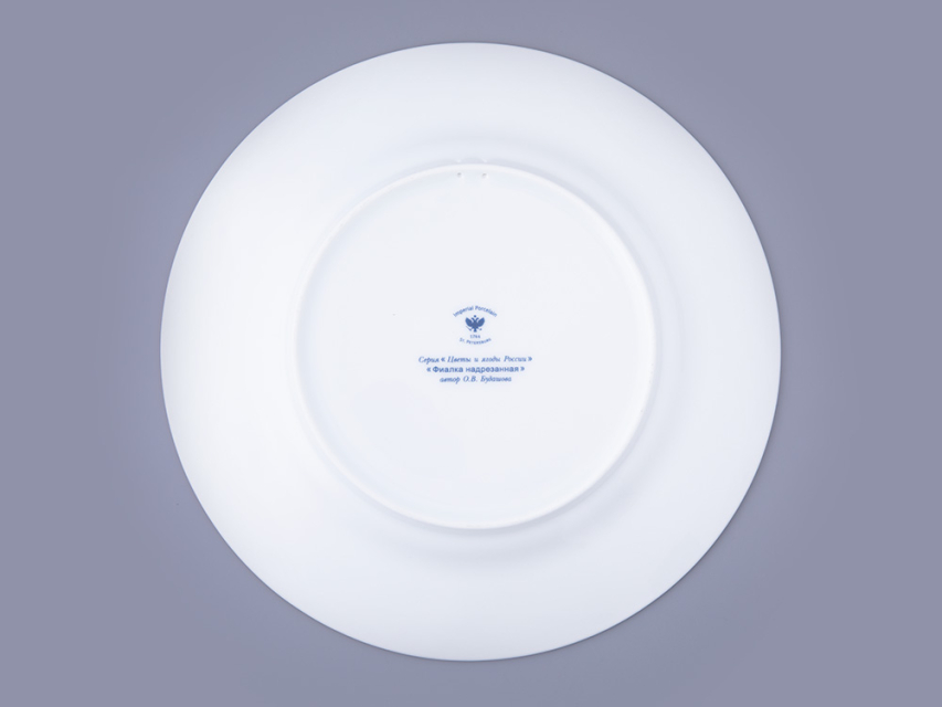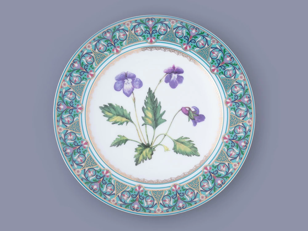 Декоративная тарелка с фиалкой надрезанной вошла в коллекцию «Цветы и ягоды России». Композиция на фарфоре, выполненная в эстетике винтажных ботанических иллюстраций, дополнена орнаментальным бортом. Рисунок представляет собой авторское размышление на тему национальной вышивки.